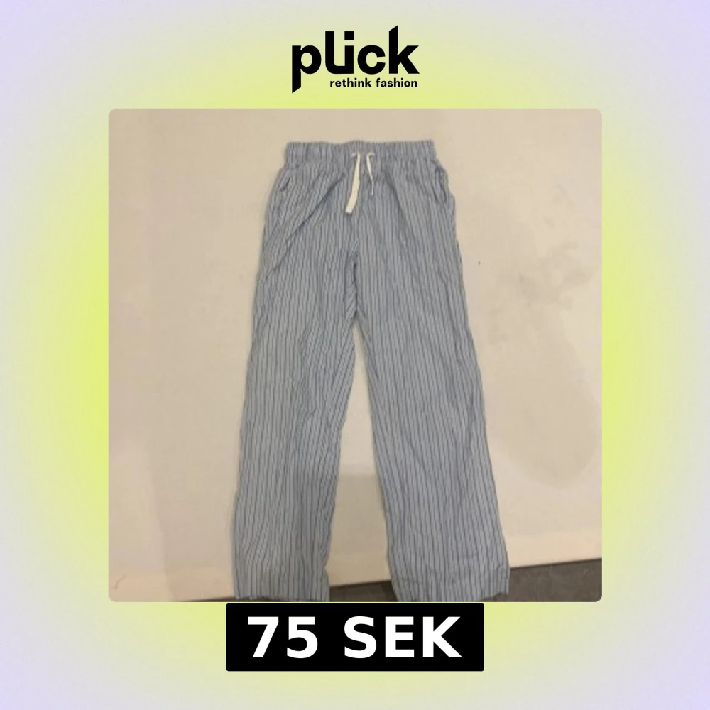 Säljer ett par bekväma och stilrena randiga byxor från Lindex. De är ljusblå med vita och svarta ränder och har en elastisk midja med snörning för extra komfort. Perfekta för en avslappnad stil.