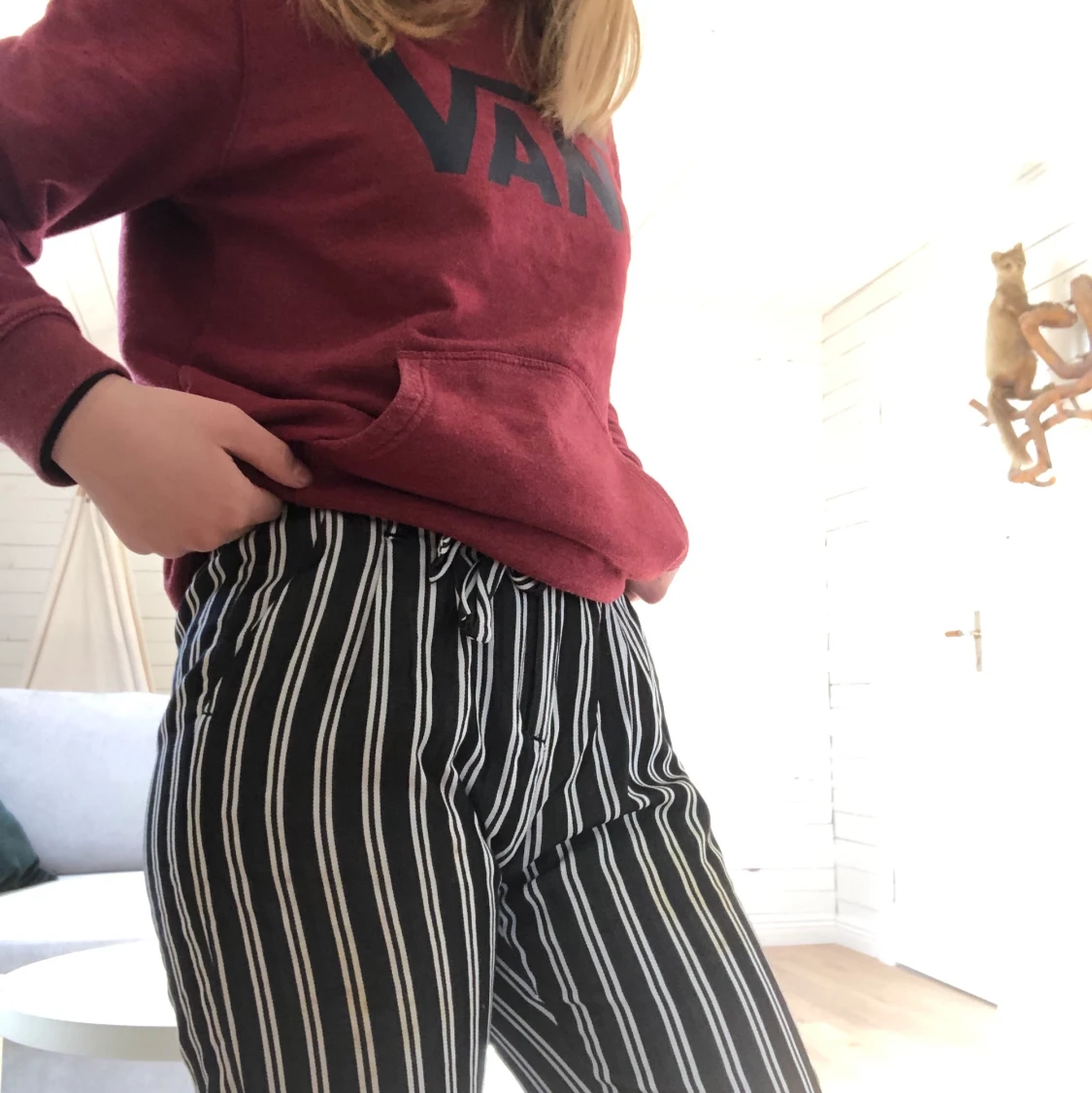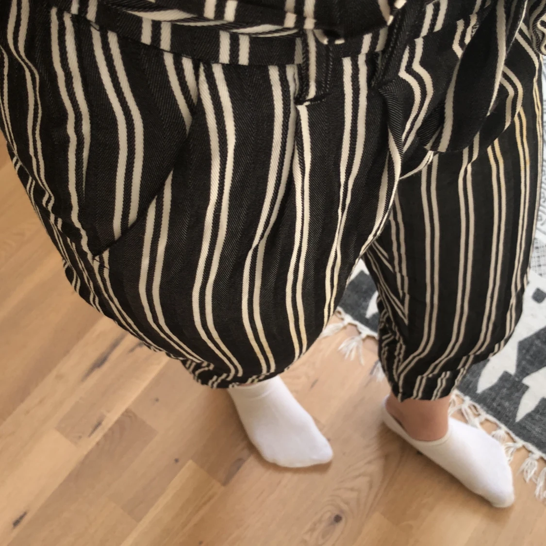 Ett par randiga kostymbyxor med fickor och ett knytskärp. Säljer dem för dem är för små för mig.