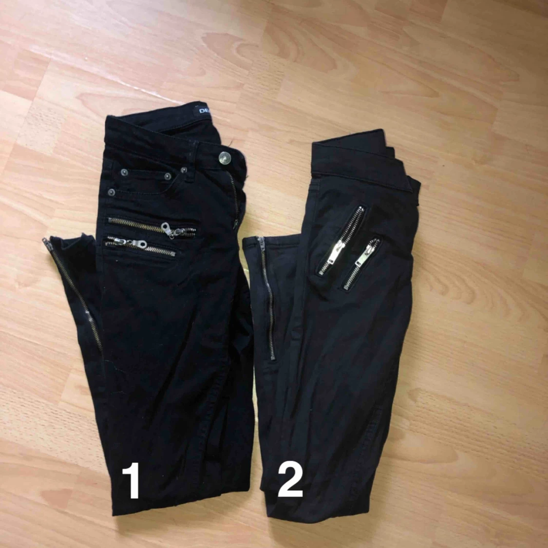 7 0 kr styck eller paketpris 120kr 1. Svarta jeans med dragkedjor vid fickorna samt anklarna som detaljer, storlek s 2. Mörkgrå jeans med dragkedjor vid fickorna samt anklarna som detaljer, storlek 34
