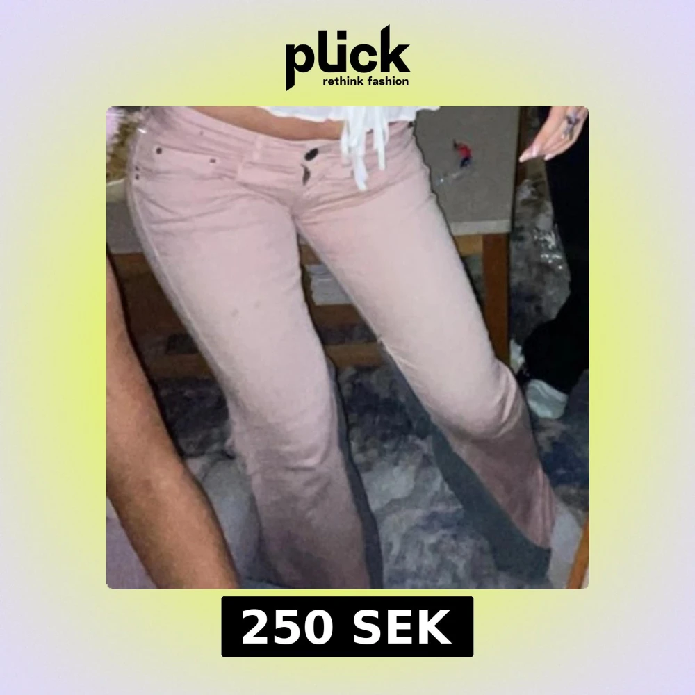 Snygga rosa bootcut jeans med låg midja. Perfekta för en avslappnad stil med en touch av retro. De har en klassisk femficksdesign och en bekväm passform. 37,5 midja rakt över, innerbenslängd 75cm
