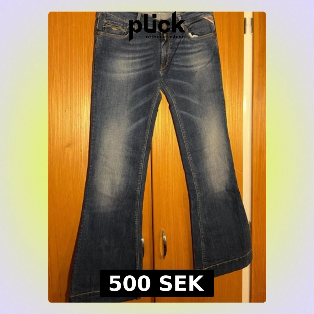 Säljer ett par blå Replay jeans med flare-ben och snygga slitningar. Klassisk femficksmodell med gul kontrastsöm och Replay-logga på fickan. Jeansen har en cool tvättad look och är tillverkade i slitstarkt denimtyg.