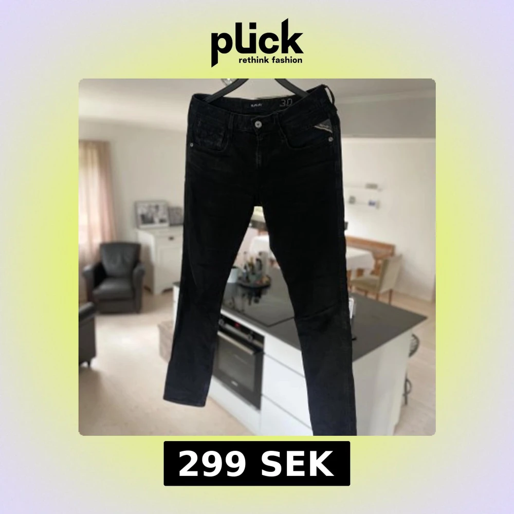 Svarta jeans från Replay med klassisk femficksdesign och snygga detaljer på bakfickorna. Slim fit-modell med smalare ben. Jeansen är tillverkade i stretchigt denim för skön passform och har metallknappar och dragkedja framtill.