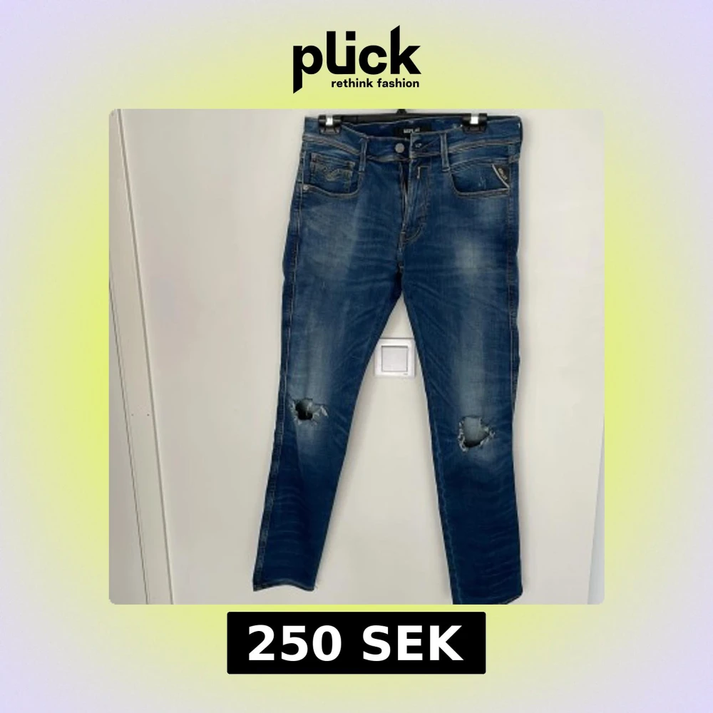 Blå Replay Anbass Hyperflex jeans med slitningar och hål på båda knäna. Klassisk femficksmodell med snygga detaljer och stretchigt material för extra komfort. Perfekta för dig som gillar en avslappnad och trendig look.
