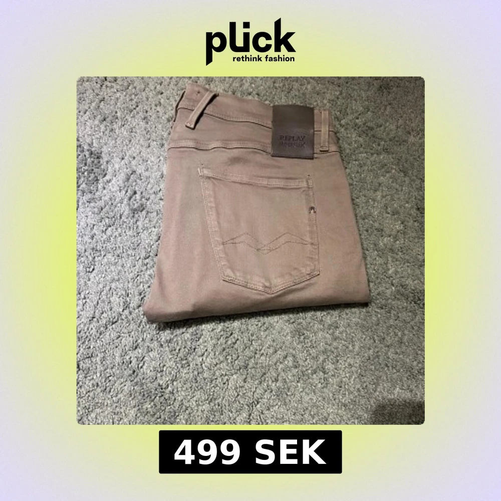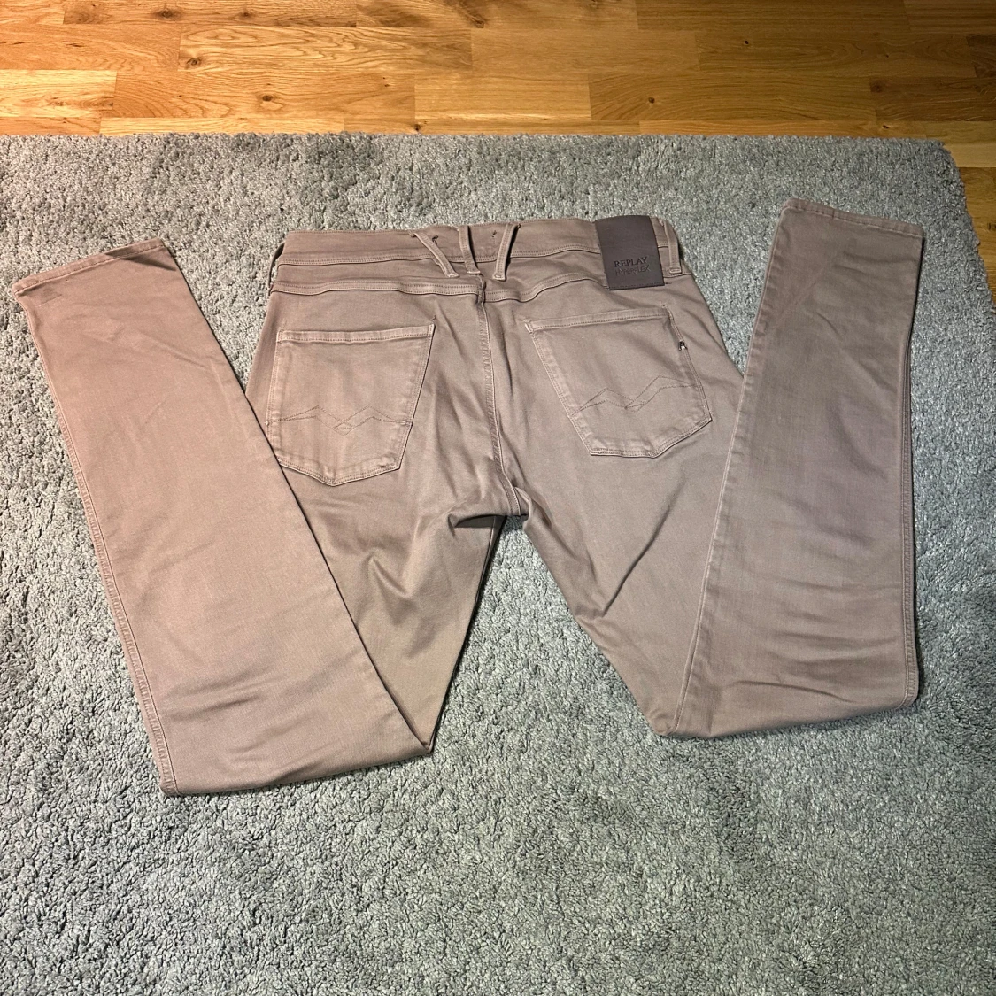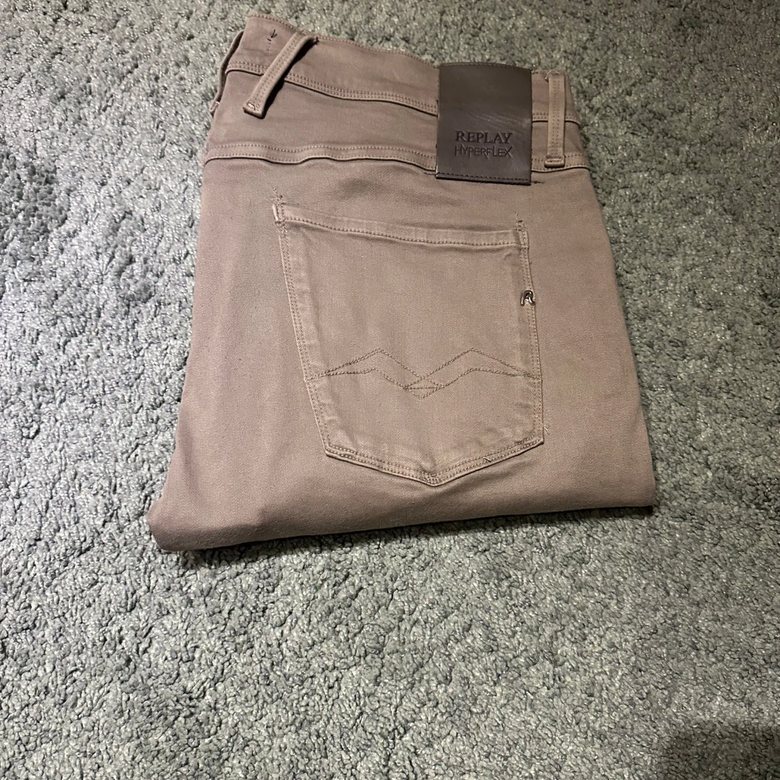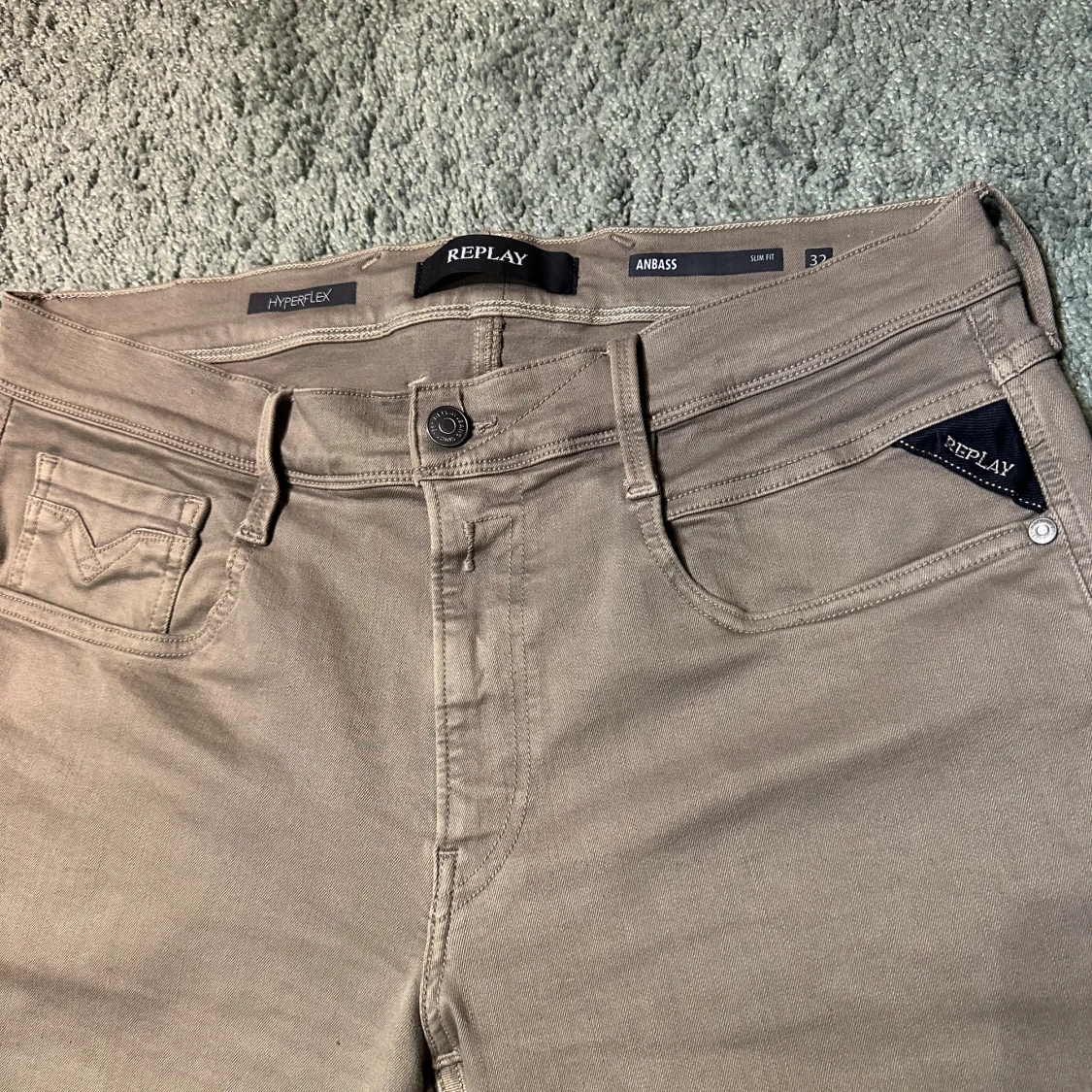 Snygga Replay Anbass Hyperflex jeans i beige med slim fit och klassisk femficksdesign. Stretchigt material för extra komfort och rörelsefrihet. Diskret Replay-logga på fickan och bakre läderpatch. Perfekta för dig som gillar stilrena och bekväma jeans.