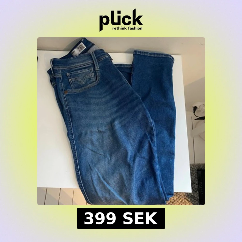 Säljer ett par Replay Anbass slim fit jeans i klassisk blå tvätt. Jeansen har fem fickor, snygga detaljer på bakfickorna och smal passform. Tillverkade i stretchig bomullsdenim för extra komfort. Perfekta för dig som gillar en modern och stilren look.