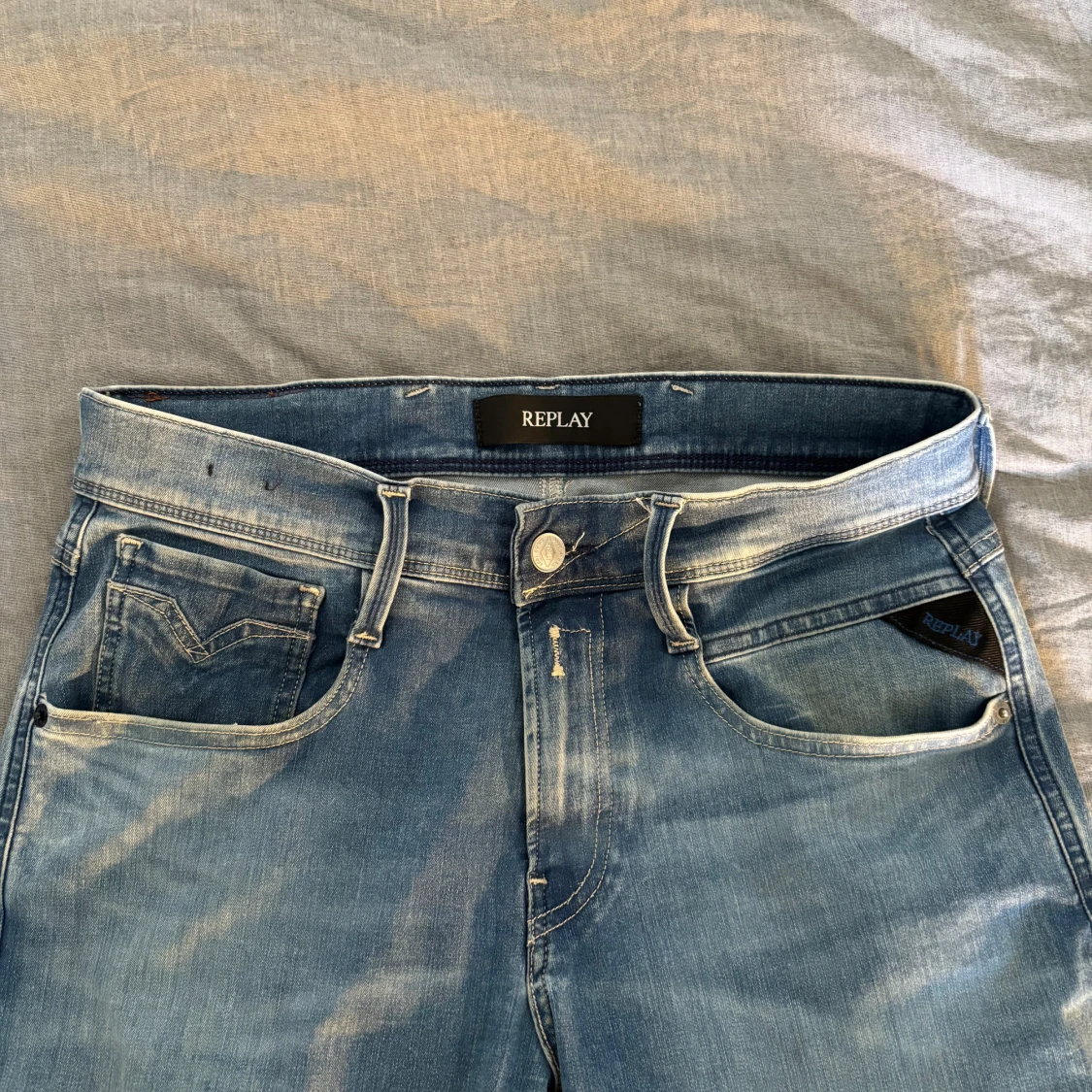 Säljer ett par Replay Hyperflex jeans i ljusblå tvätt med snygga slitningar. Klassisk femficksmodell med normal passform och raka ben. Jeansen är tillverkade i stretchigt denim för extra komfort och har Replay-logga på bakfickan och läderpatch i midjan.