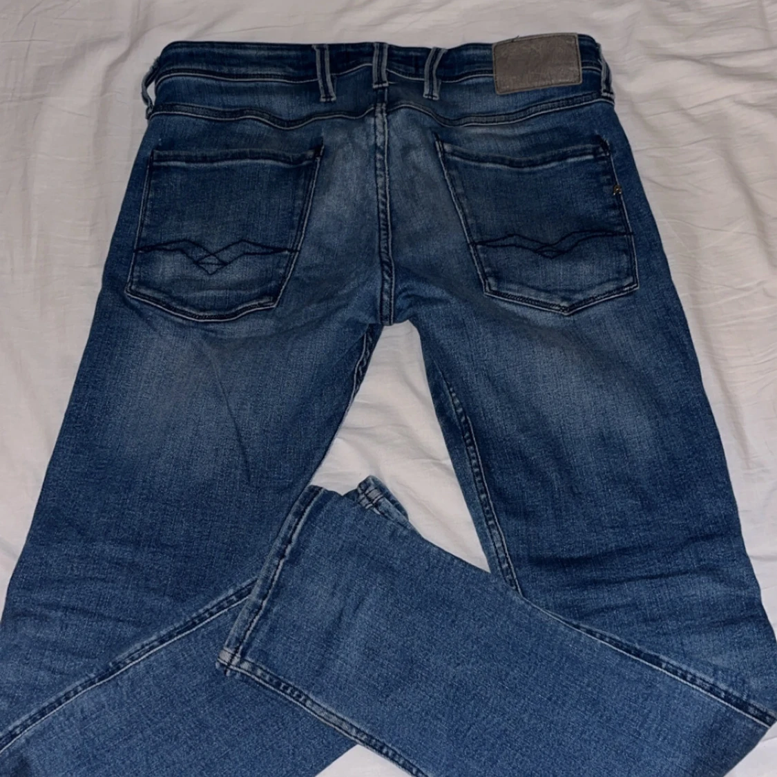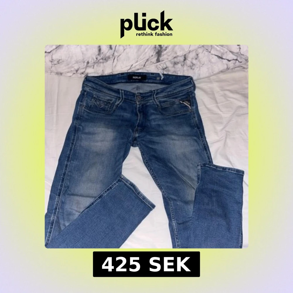 Säljer ett par klassiska blå jeans från Replay med snygga slitningar och raka ben. Jeansen har fem fickor, dragkedja och knapp i midjan samt diskreta detaljer på bakfickorna. Perfekta för en avslappnad och stilren look. Storlek 32/32