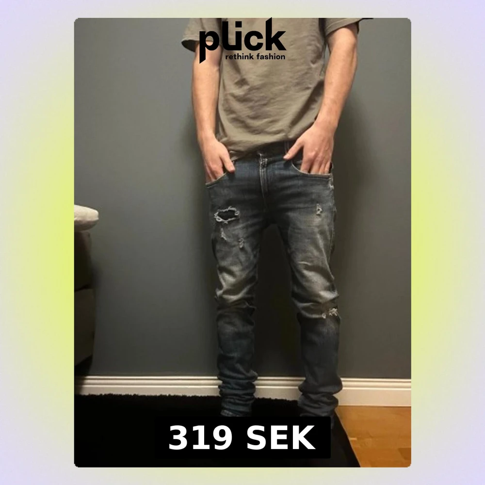 Säljer ett par Replay Anbass jeans i blå tvätt med slitningar och trasiga detaljer på framsidan. Skinny fit med låg midja. Jeansen har en snygg faded effekt och är gjorda i stretchig bomull för skön passform. Skick 8/10