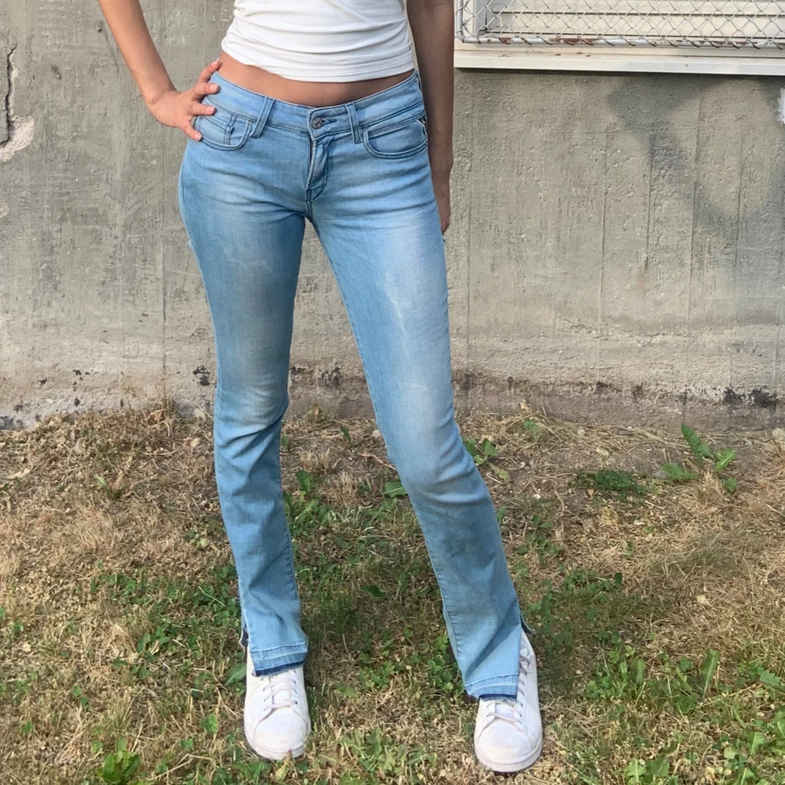 Snygga ljusblåa Low waist jeans från Replay. Jag är 175cm och brukar bära storlek S, säljer exakt samma jeans i mörkblå färg också.