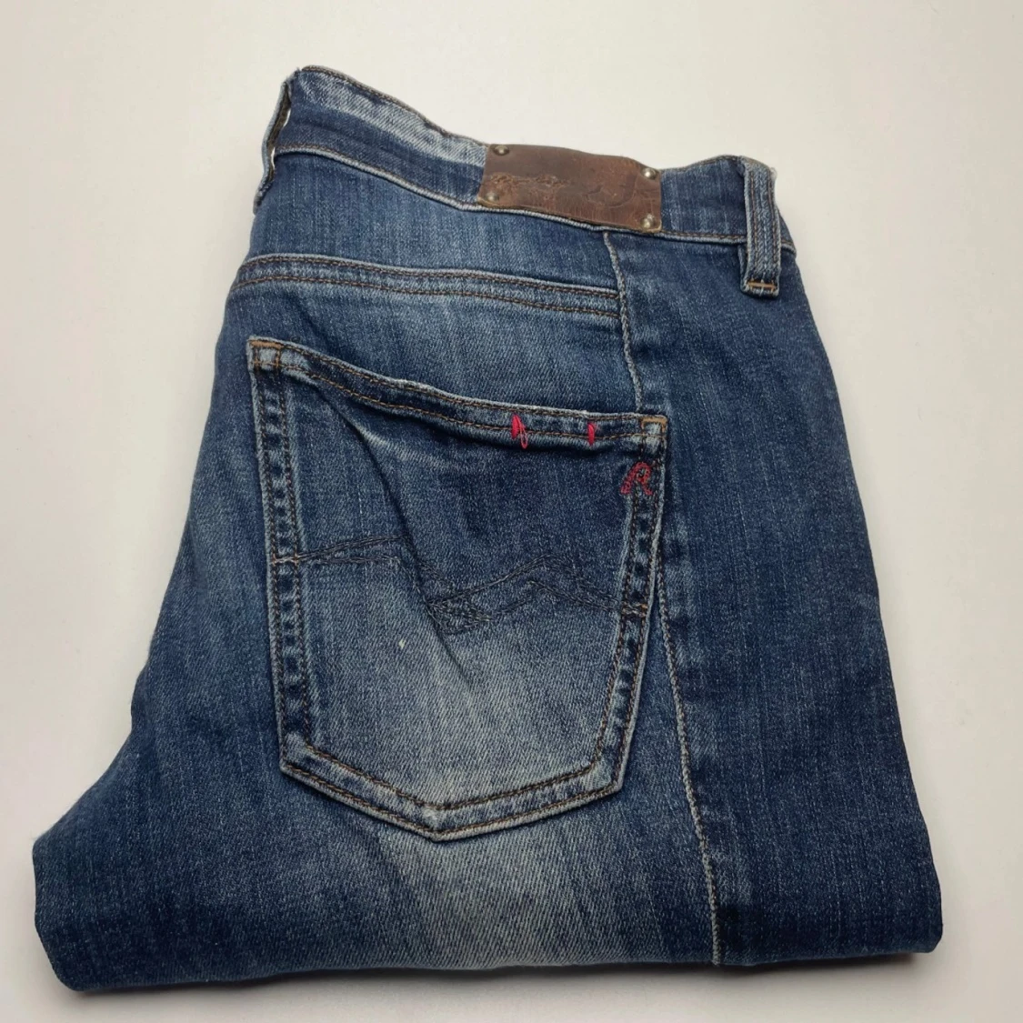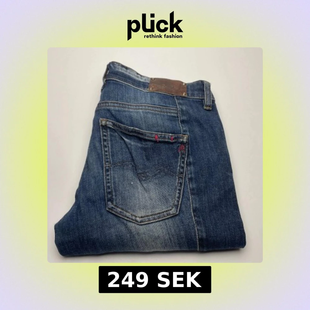 Snygga blå jeans från Replay, modell Radula. Klassisk femficksdesign med slitningar och kontrastsömmar. Jeansen har röda detaljer vid fickorna och är tillverkade i bomull med en skön jeanskänsla. Perfekta för en avslappnad och cool stil.