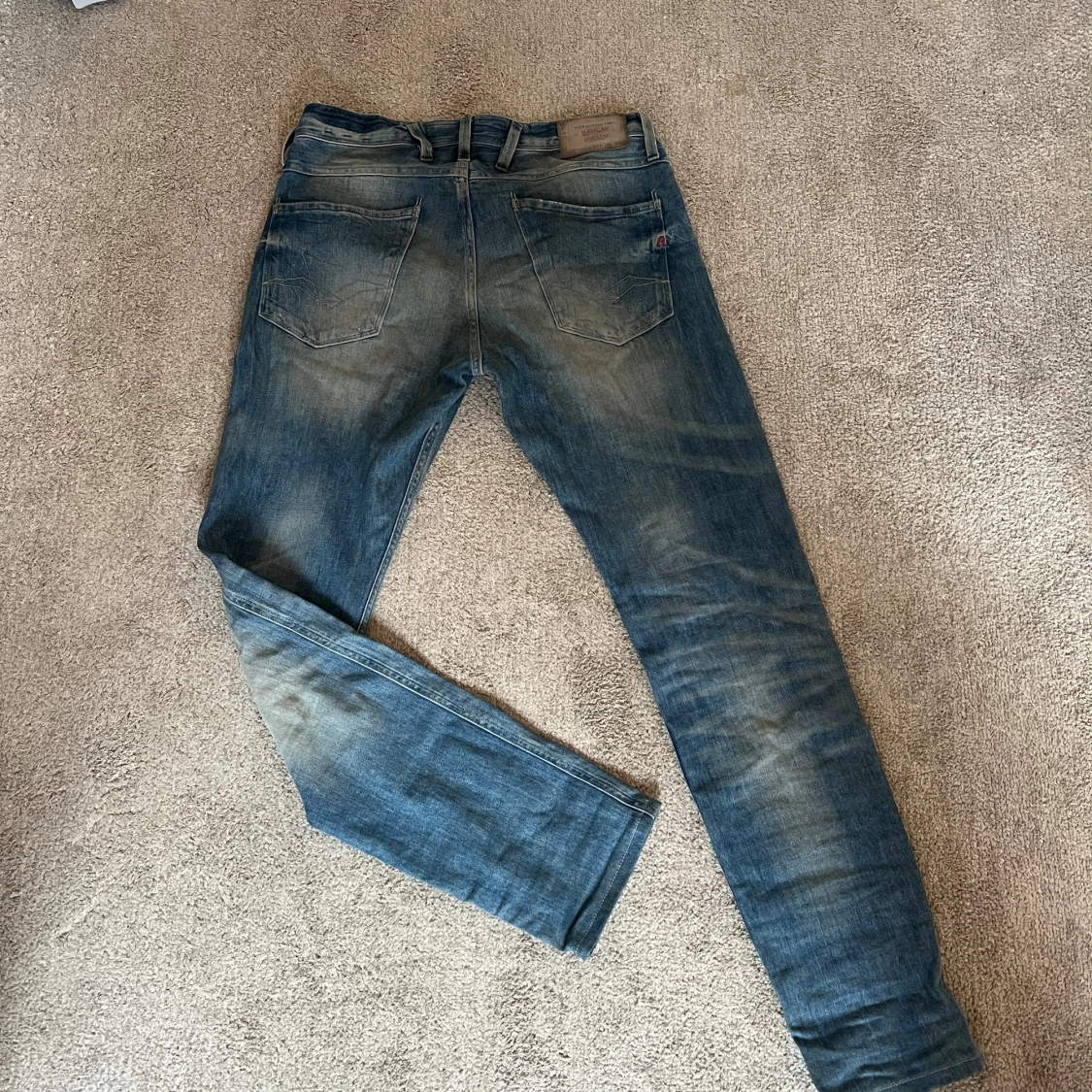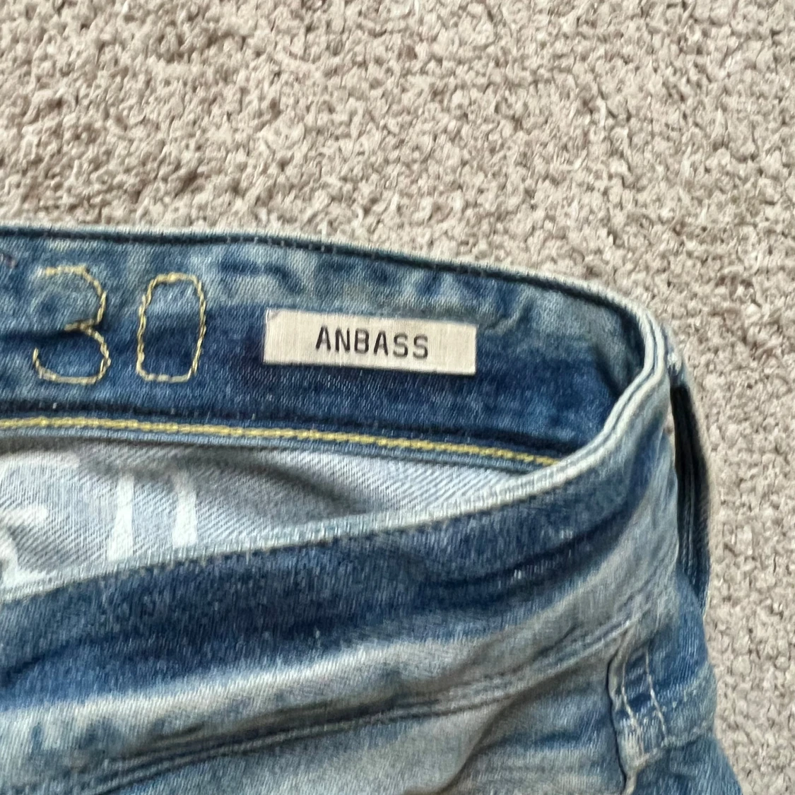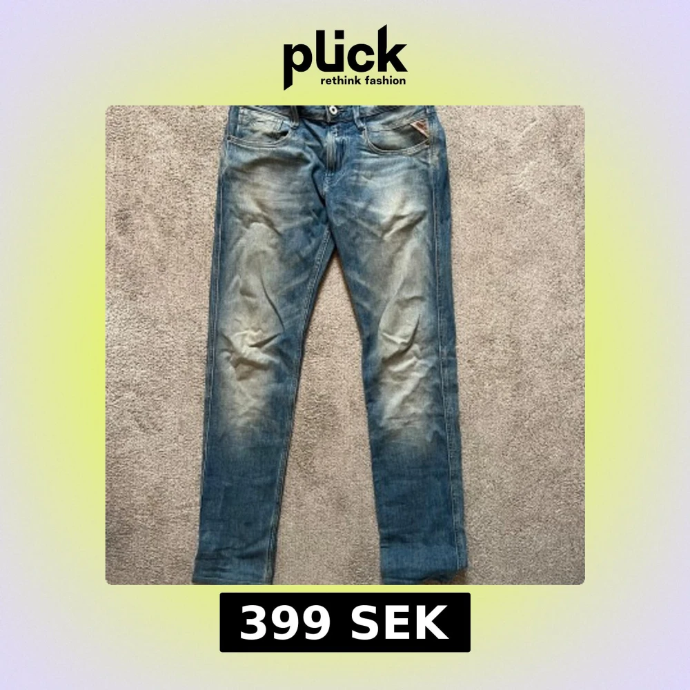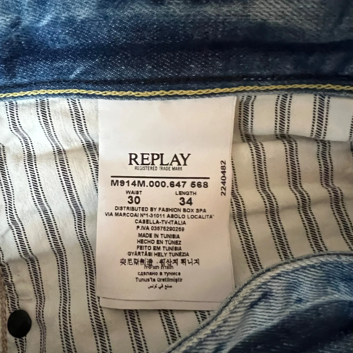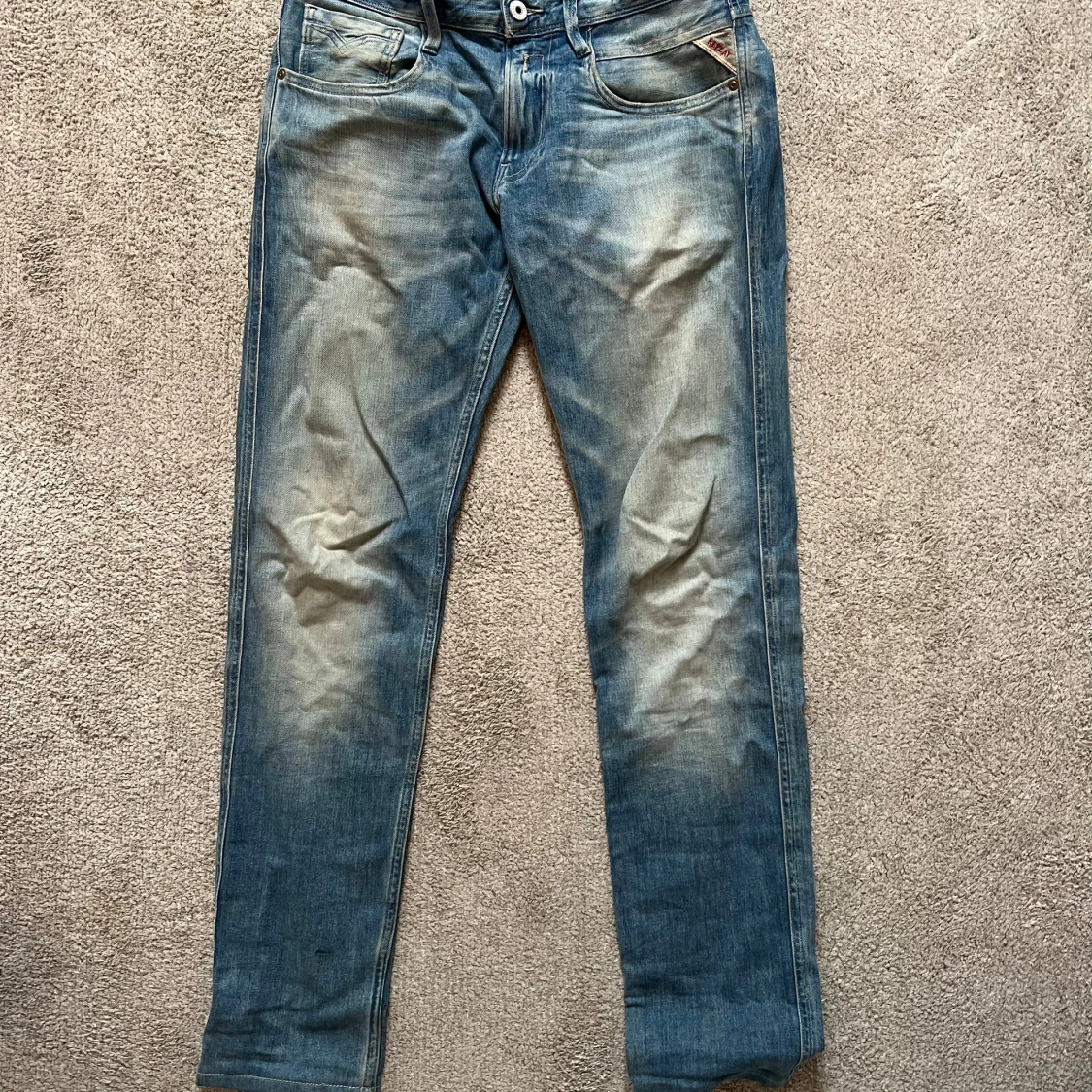 Säljer ett par blå Replay Anbass jeans med klassisk femficksdesign och lätt slitna detaljer framtill och baktill. Byxorna har normal passform och raka ben, perfekt för en avslappnad stil. Midjan är midwaist och materialet är jeans.