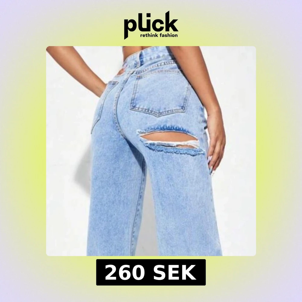 Snygga ljusblå jeans med hög midja och slitning på baksidan. De har en straight passform och är tillverkade i klassiskt denimtyg. Använda en gång men säljer då det inte är min stil. Frakt ingår i priset