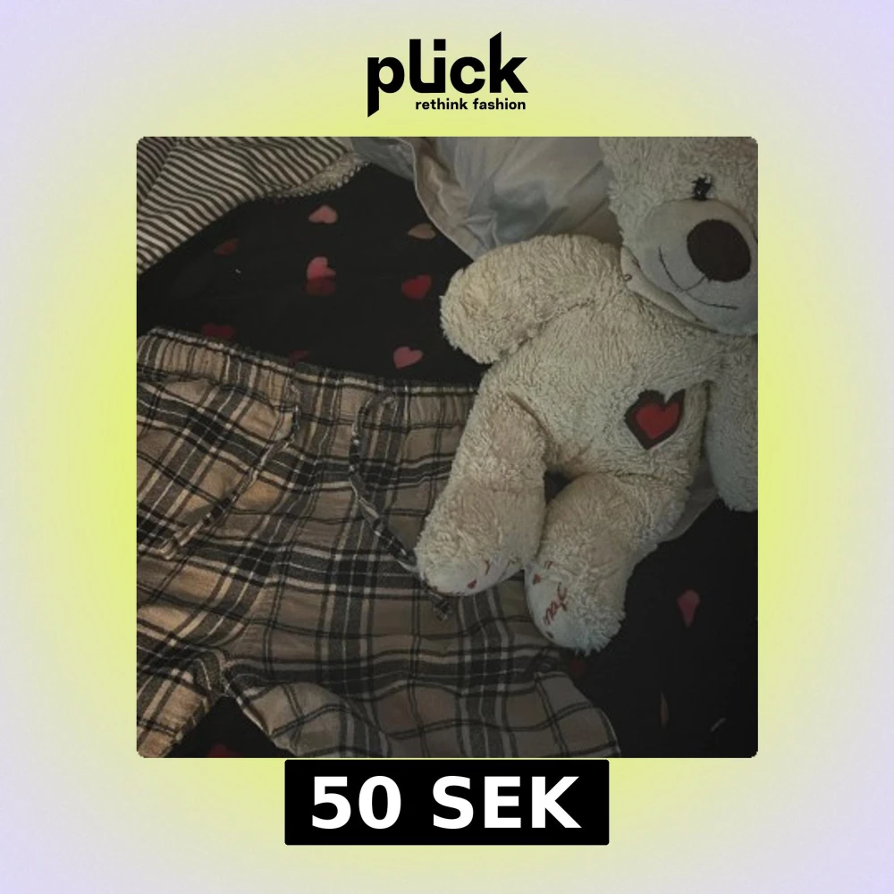 Säljer ett par bekväma pyjamasbyxor med rutig design i svart och beige. Byxorna har en loose passform och är utrustade med snörning i midjan för justerbar passform. Perfekta för en avslappnad stil.
