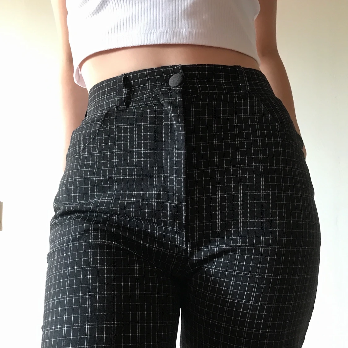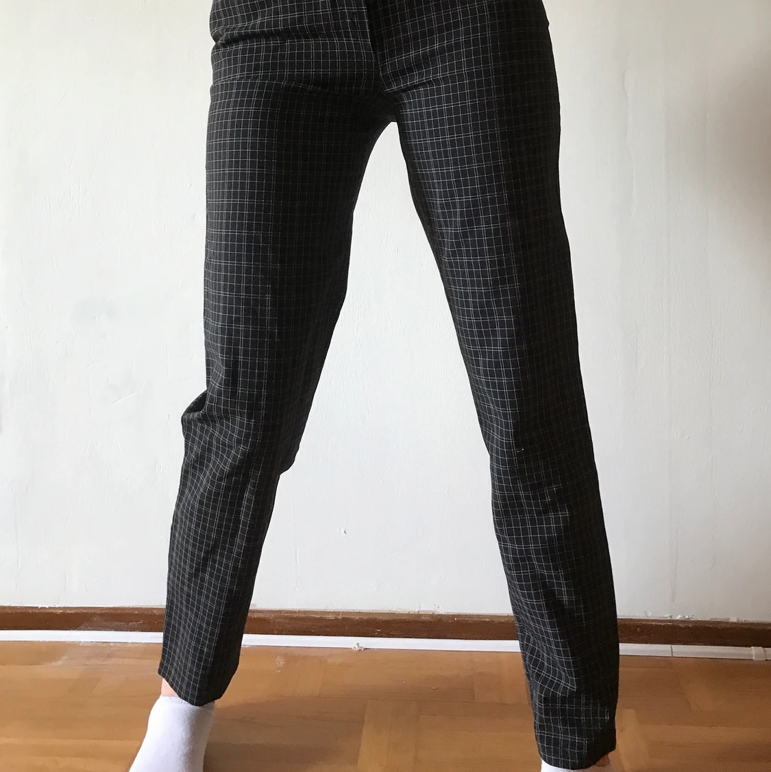 Ett par svarta byxor med vitt rutnätmönster, köpta på secondhand i Frankrike! Visad på mig som är 168 cm lång och har 25” i midjemått. Säljer pga de är lite för små för mig i midjan, skulle passa någon som brukar ha EU 32/34 eller 24”/23” i midjemått. Felfritt skick och sitter som en smäck! Bara att kontakta mig om ni har några ytterligare frågor✨