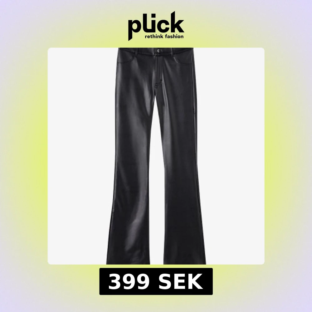 Svarta bootcut skinnbyxor - Säljer ett par snygga svarta skinnbyxor som är bootcut och midwaist, men man kan även vika ner de så det blir Lowwaist. Säljer för det inte kommer till andvänding längre, köpte de har på Plick så de är inte jag på bilden men jag är 165 ungefär och det är perfekta i längden. Perfekta nu till hösten