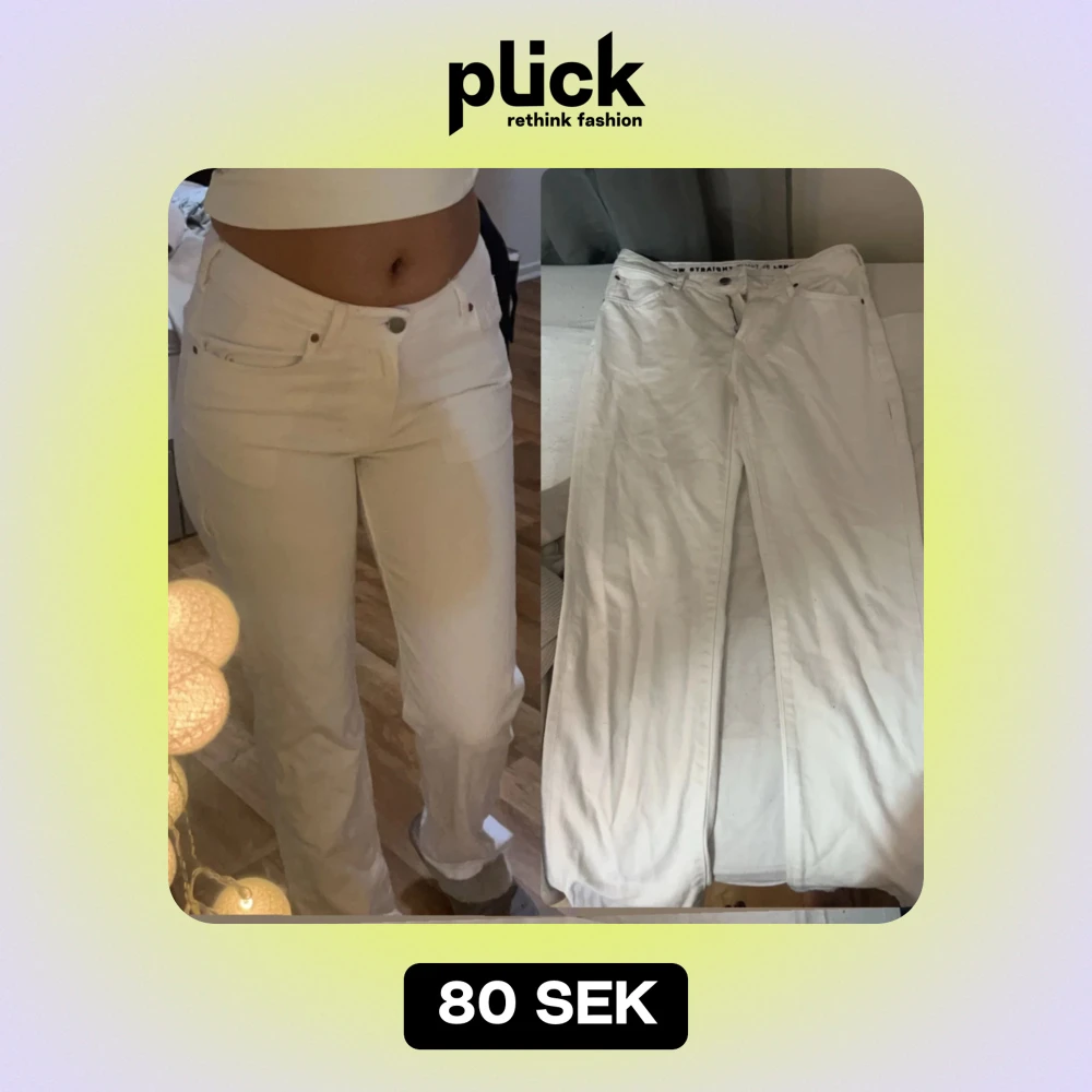 Säljer ett par vita low straight jeans i mycket bra skick. De har en klassisk femficksdesign och en knappgylf. Perfekta för en avslappnad stil och passar till de flesta tillfällen. Midjan är låg och byxorna har en rak passform som ger en snygg siluett. Passar till S och XS, jag är 170 💘
