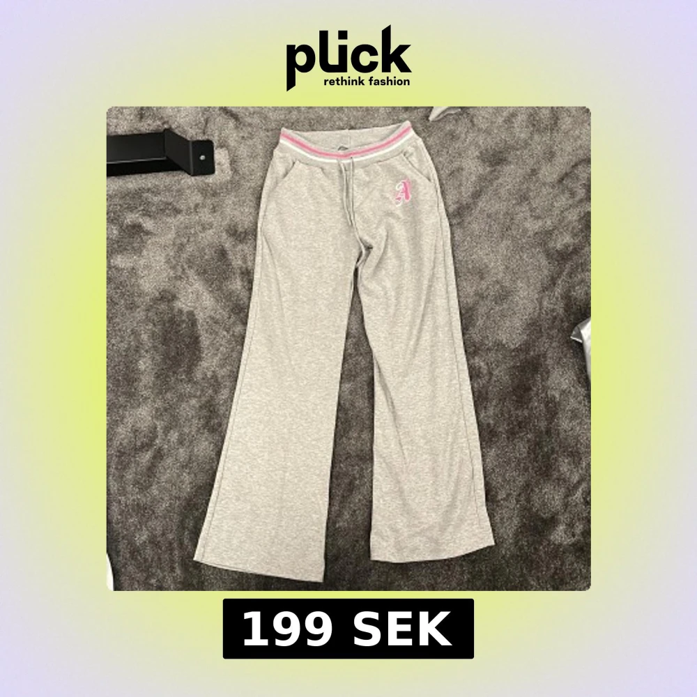Grå mjukisbyxor med breda ben och elastisk midja med rosa och vit rand. Byxorna har fickor och en broderad rosa bokstav på ena höften. Perfekta för chill dagar eller när du vill vara extra bekväm. S/XS