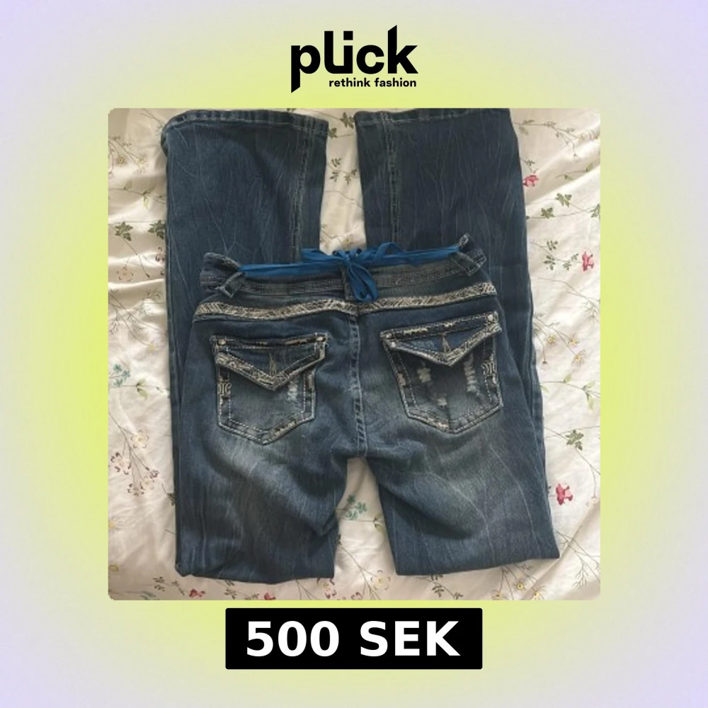 Snygga blå jeans med broderade detaljer och slitningar på bakfickorna. Byxorna har raka ben, normal passform och en blå snörning i midjan. !!!KOPIOR!!!!Dekorativa sömmar och slitna partier ger en cool look. Perfekta för dig som gillar unika detaljer.