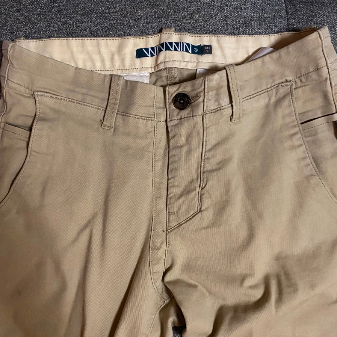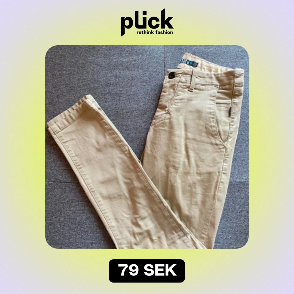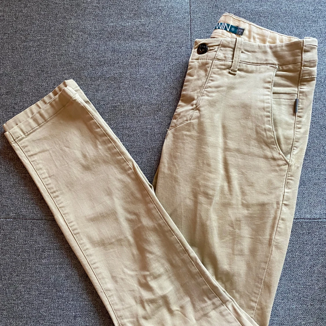 Säljer ett par snygga beige chinos i normal passform. De har en klassisk design med knappar och bälteshällor. Perfekta för både vardag och fest!