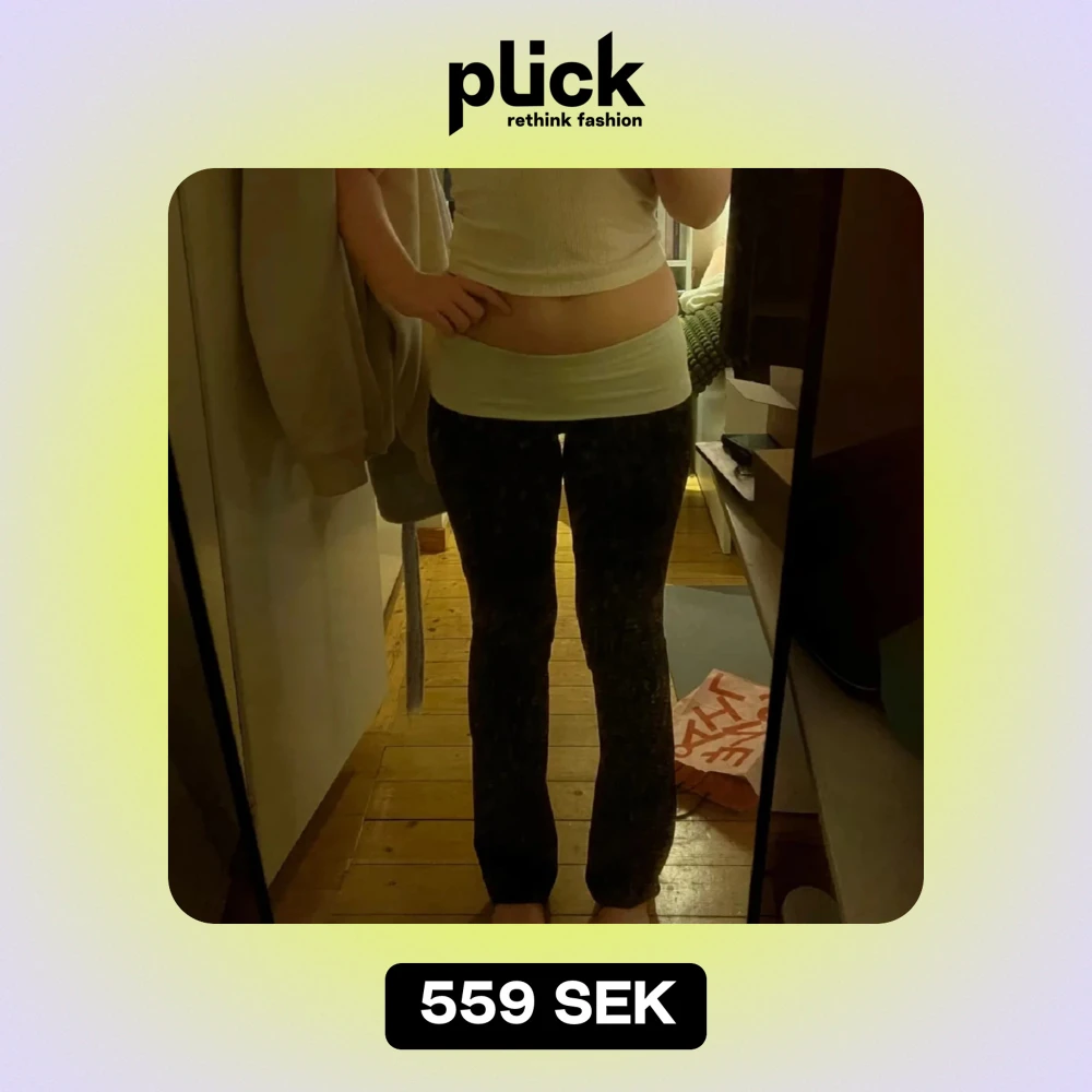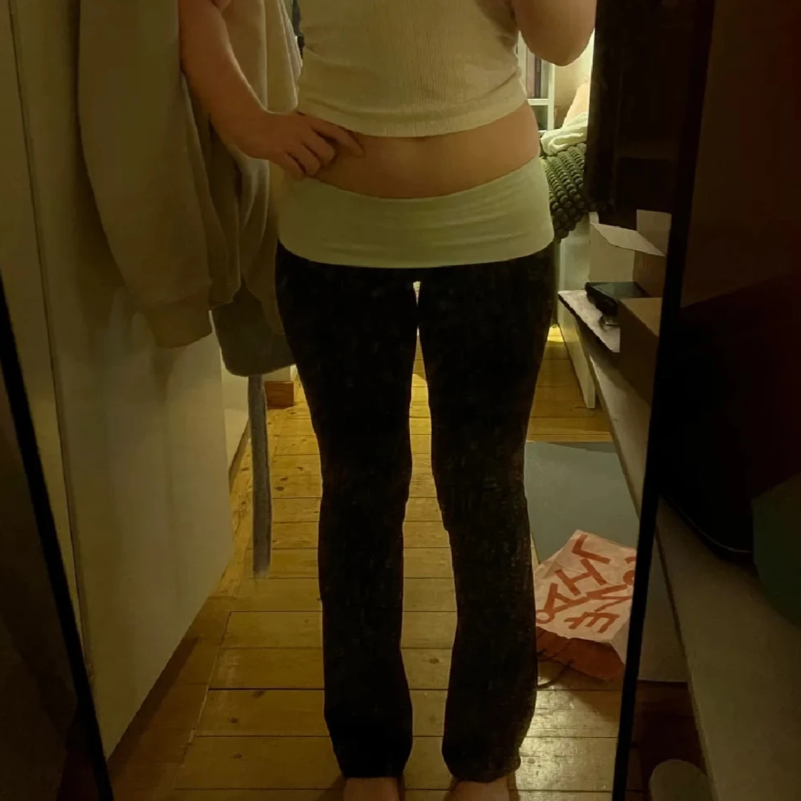 Säljer ett par utsvängda fold over svarta leggings från PINK med en bred, ljusgrön midja och glittrande textdetaljer. Köpt här på Plick och bilderna är därifrån. Säljer pga av att jag inte använder de längre,skriv privat för fler bilder,köpta för 650kr. Modellen är 168/9 cm och byxorna var lite för korta för henne. TRYCK INTE PÅ KÖP NU UTAN KONTAKTA MIG FÖRST! 🩵🩵