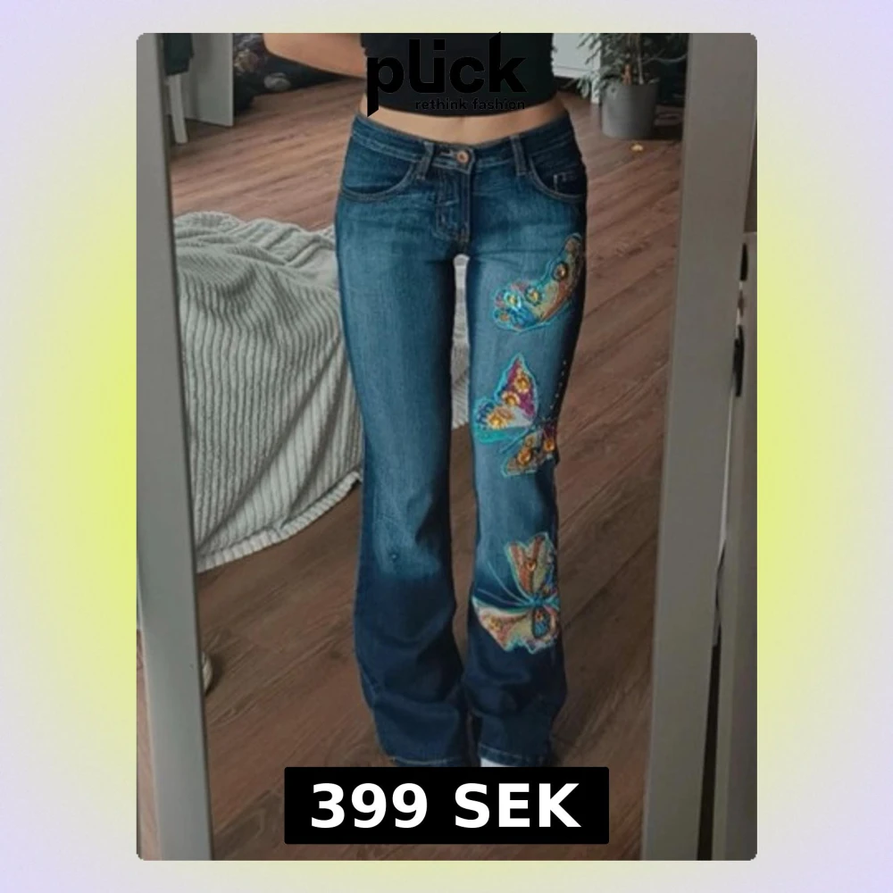 Säljer för att de inte passar mig, därav inte mina bilder!! Dem är bootcut och har broderade fjärilar på benet samt finns broderade fickor. Storlek S men passar mer som en XS