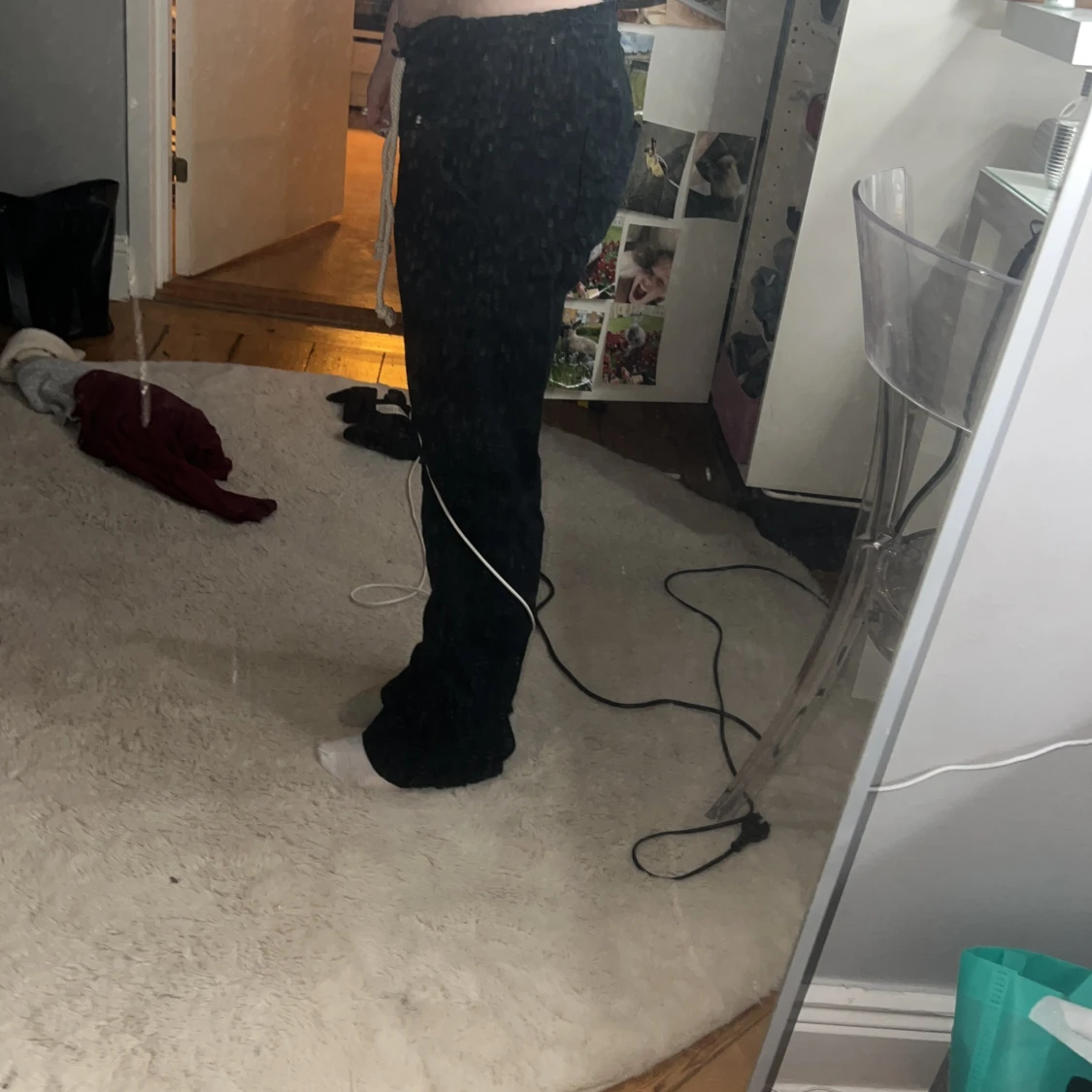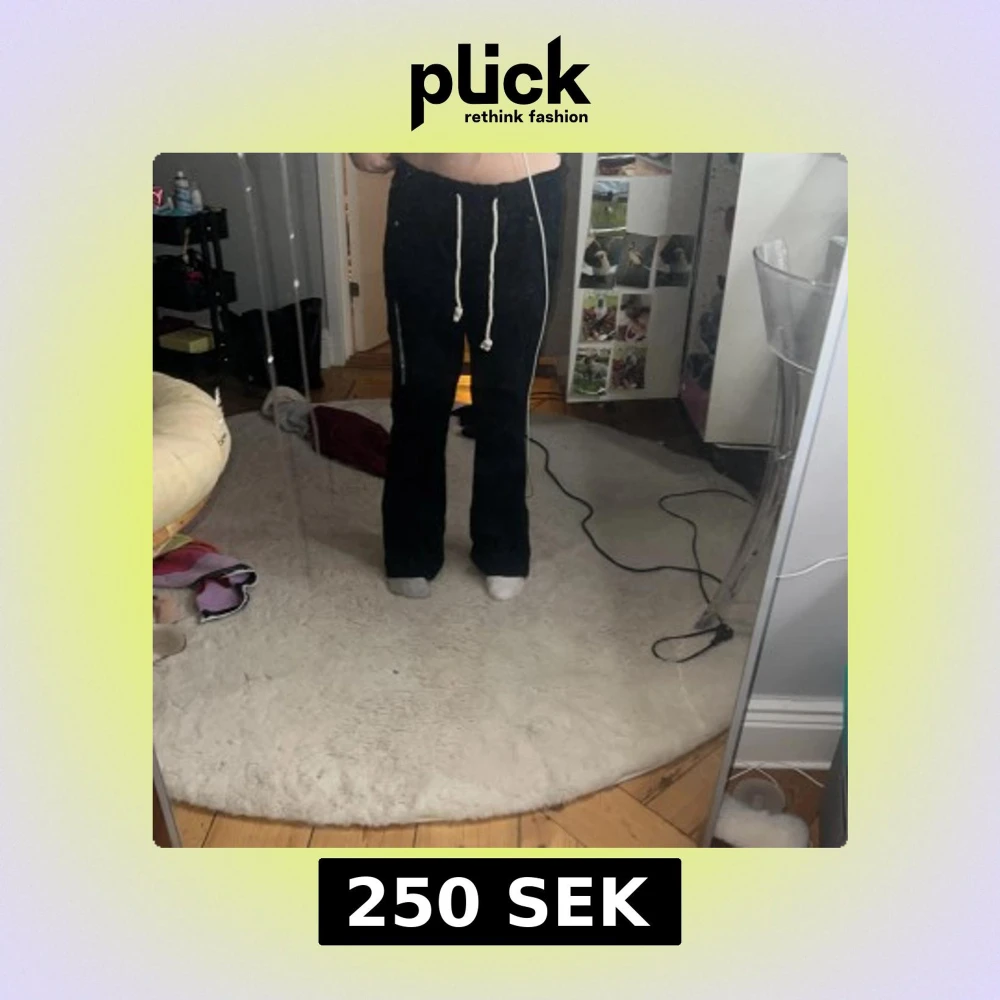 Säljer ett par svarta linnebyxor med vita snören i midjan. Byxorna har bootcut-ben och sitter skönt med loose passform. .