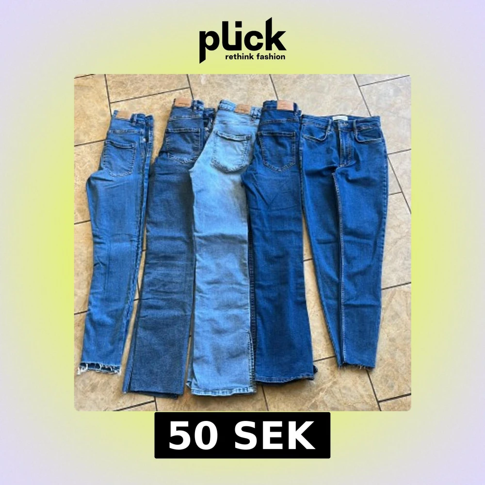 Fem par blå jeans i olika tvättar från Gina Tricot och Zara. Modellerna varierar från ljusblå till mörkblå, med raka och smala ben. Några har råa fållar och klassiska femficksdetaljer. Perfekta för dig som gillar jeans i olika stilar och nyanser. I storlek xs o s 50kr/st