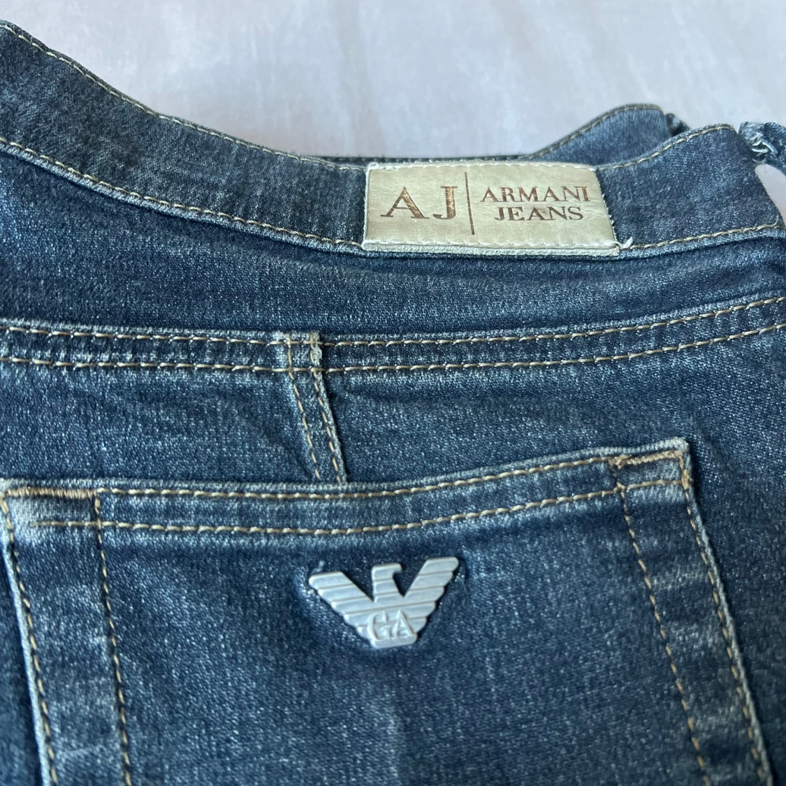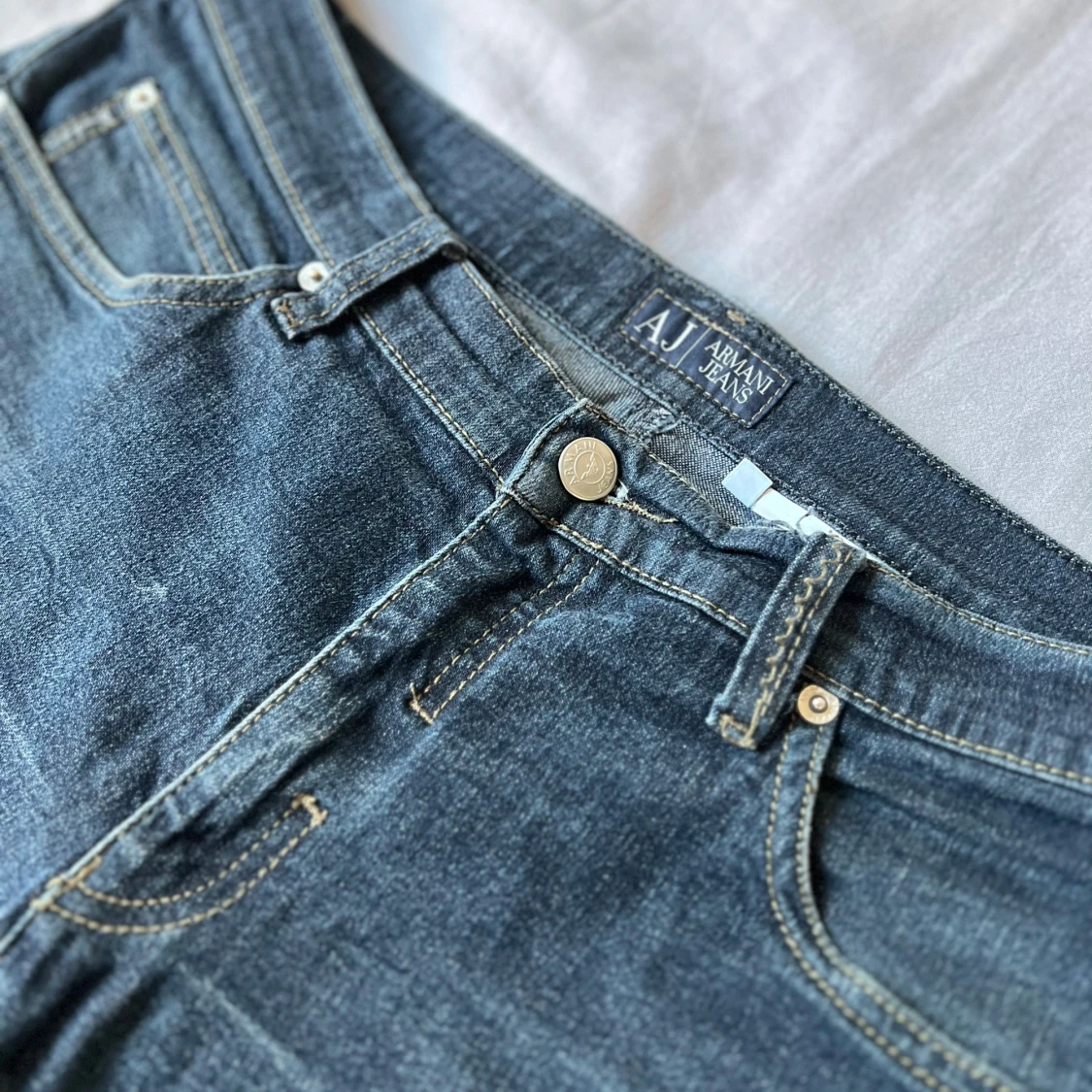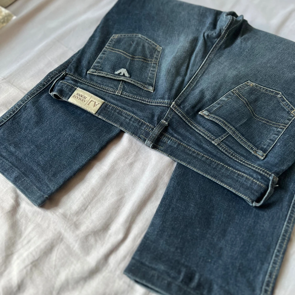 Snygga mörkblå jeans från Armani Jeans med klassisk femficksdesign och silverfärgad logga på bakfickan. Jeansen har kontrastsömmar och metallknapp framtill. Perfekta för dig som gillar stilrena och tidlösa jeans med exklusiv känsla.