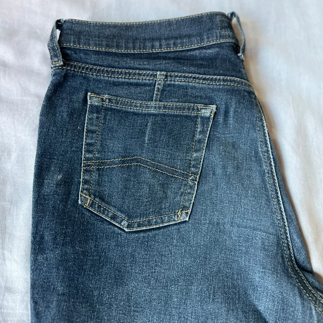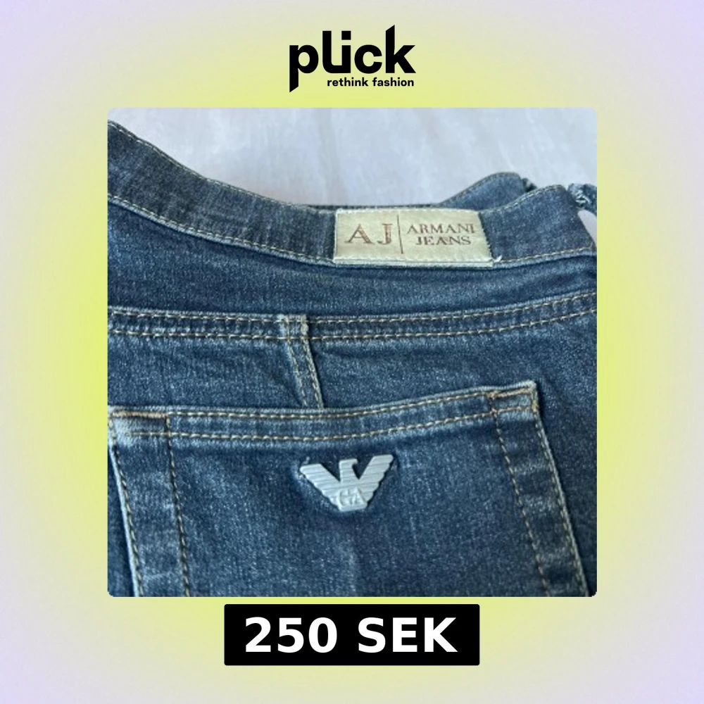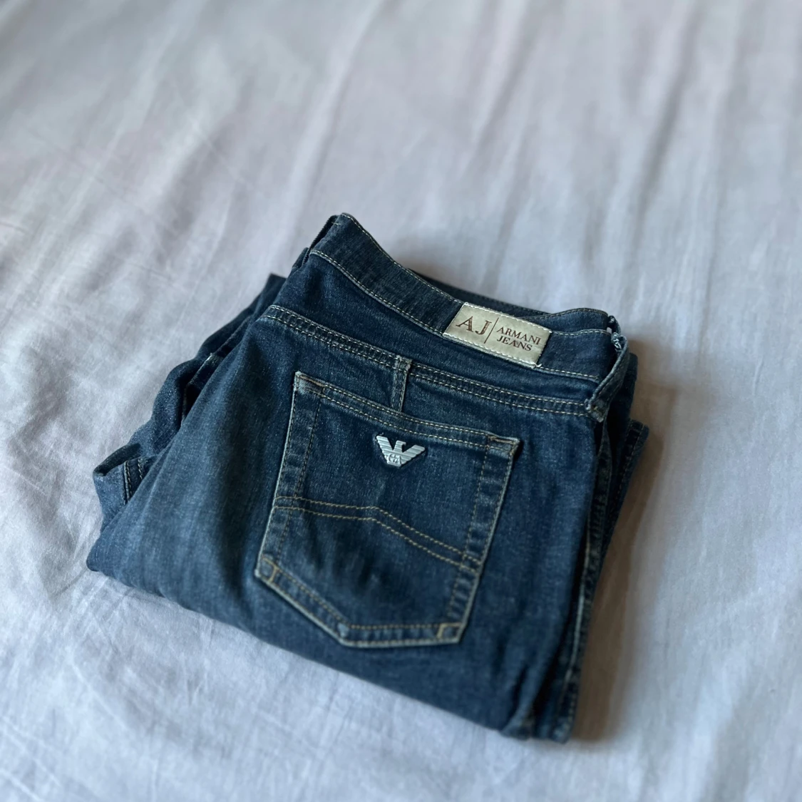 Snygga mörkblå jeans från Armani Jeans med klassisk femficksdesign och silverfärgad logga på bakfickan. Jeansen har kontrastsömmar och metallknapp framtill. Perfekta för dig som gillar stilrena och tidlösa jeans med exklusiv känsla.