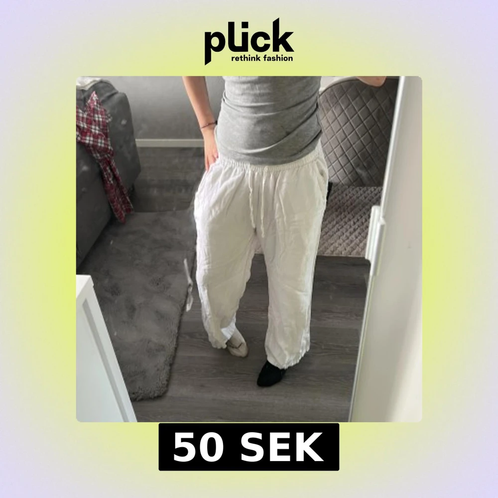 Säljer ett par vita linnebyxor med avslappnad passform och resår i midjan med snörning. Byxorna har raka ben och är perfekta 💗