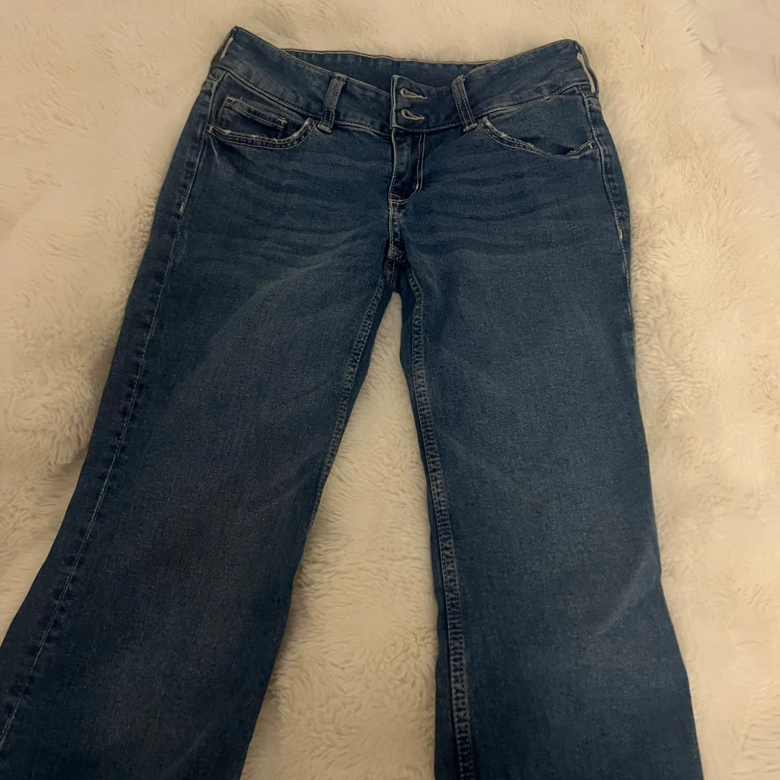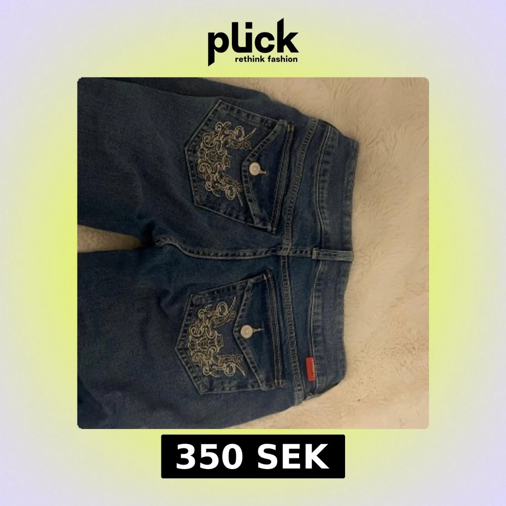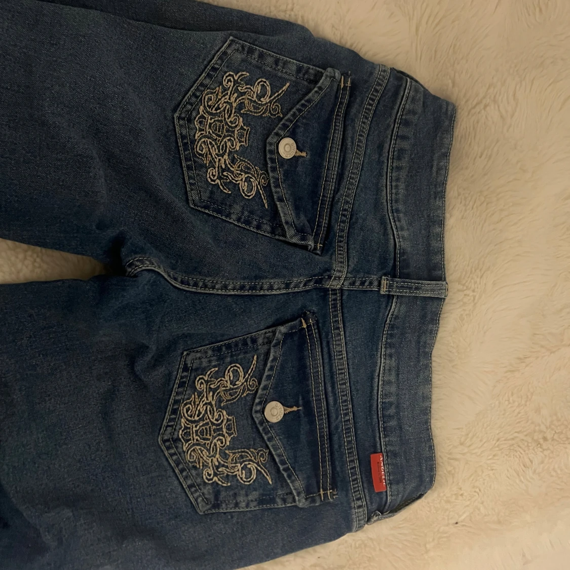 Snygga blå jeans med unika broderade detaljer på bakfickorna och dubbla knappar framtill. Klassisk femficksmodell i jeansmaterial, perfekt för dig som vill sticka ut lite extra. Jeansen har en rak passform och låg midja.