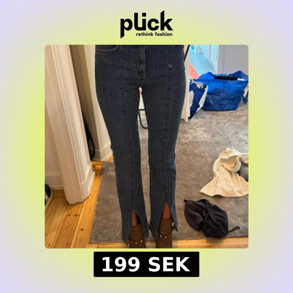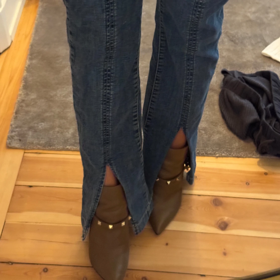 Säljer ett par blå jeans med coola slitsar framtill vid bensluten. De har hög midja och raka ben med markerade sömmar längs framsidan. Jeansen är i klassisk denim och har en snygg, modern look som passar till boots eller sneakers.