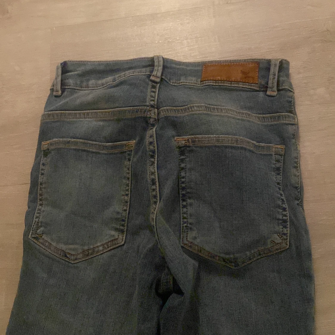 Säljer ett par klassiska blå jeansbyxor i storlek S. De har en rak passform och är tillverkade i ett slitstarkt denimtyg. Perfekta för en avslappnad stil.