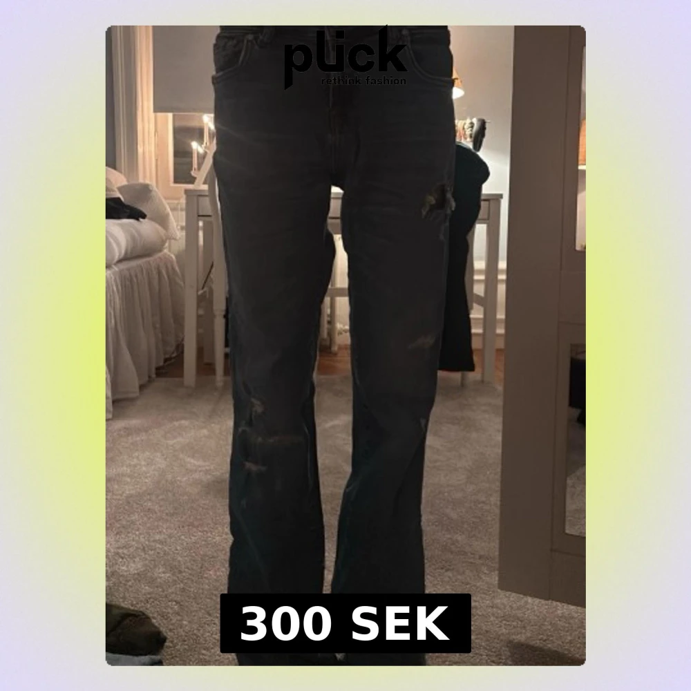 Blåa jeans med snygga hål, har ett hål på sidan som man ser på sida 3 men går enkelt att sy