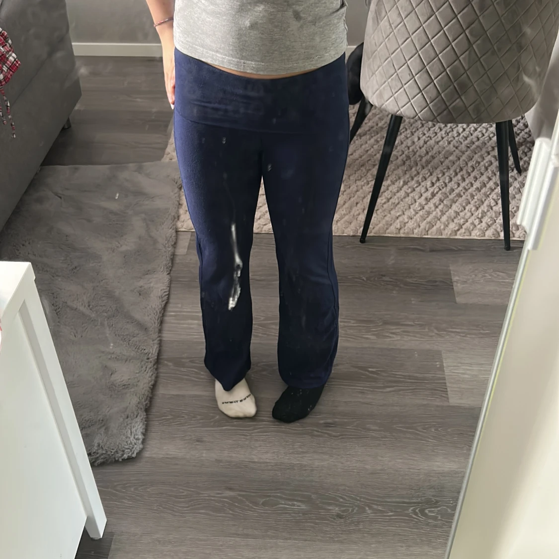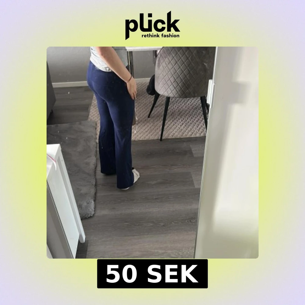 Säljer ett par mörkblå mjukisbyxor med bootcut och hög midja. Byxorna är i mjukt material och har en skön passform som sitter tajt 💗