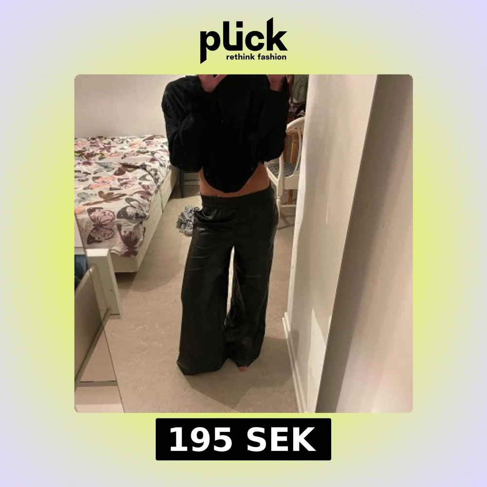 Säljer ett par svarta byxor i skinnimitation med resår i midjan. Byxorna har en loose och wide passform som ger en avslappnad look. Perfekta att styla med en crop top eller hoodie.