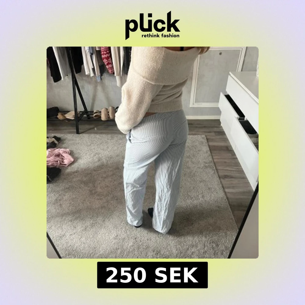 Säljer ett par ljusblå kostym/hemma byxor med smala vita ränder. Byxorna har en relaxed passform med raka ben och low waist. Perfekta för en chill och stilren look, passar dig som gillar bekväma och luftiga plagg. Ny pris 600. Även en fleck typ precis i början av fickan vilket inte syns typ och sen en liten på knät som inte heller syns eller man tänker på.
