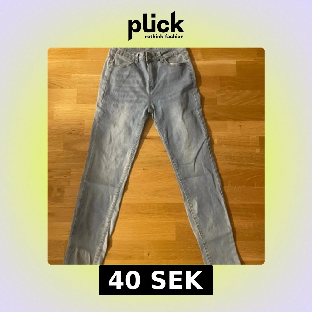 Säljer ett par ljusblå skinny jeans med klassisk femficksdesign och hög midja. Jeansen har bälteshällor, dragkedja och knapp framtill. Perfekta för dig som gillar en tight passform och vill ha en enkel, stilren look.