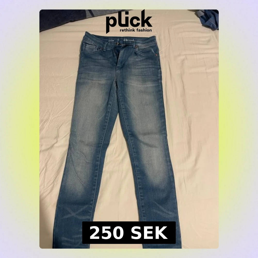 Snygga blå skinny jeans med stretch och klassisk femficksdesign. Jeansen har ljusa slitningar framtill och smal passform som sitter tajt längs benen. Perfekta för dig som gillar en modern och stilren look.