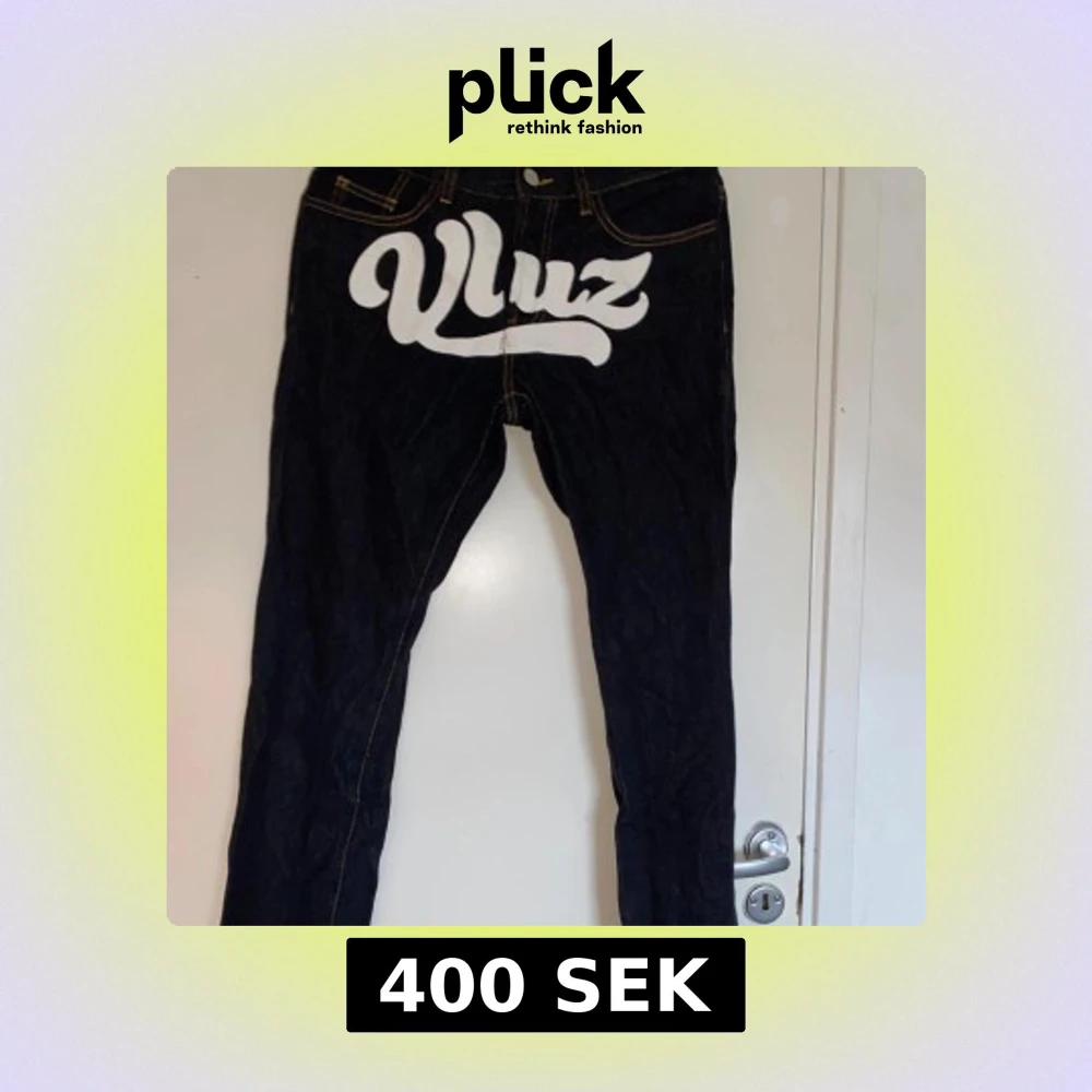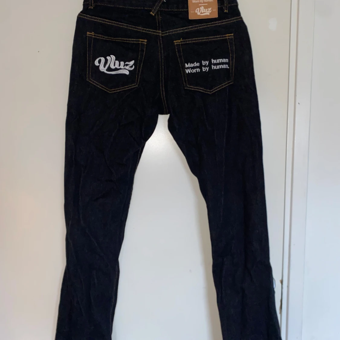 Unika svarta jeans från Vluz med stort vitt tryck framtill och broderade detaljer på bakfickorna. Snygga kontrastsömmar och klassisk femficksdesign. Materialet är robust denim och passformen är rak. Perfekt för dig som vill sticka ut med cool streetstil.