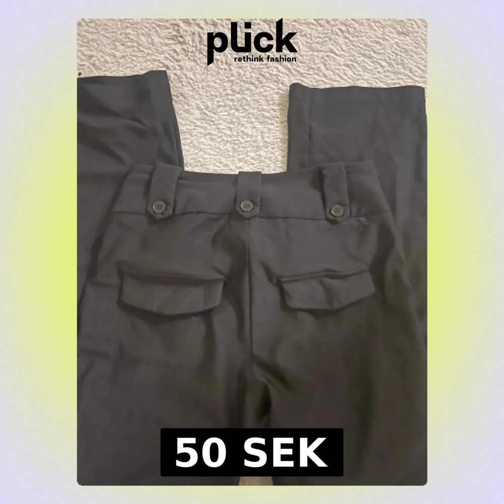 Säljer ett par svarta kostymbyxor med breda bälteshällor och dekorativa knappar i midjan. Byxorna har raka ben och låtsas fickor med lock bak. Perfekt för en clean och stilren look.