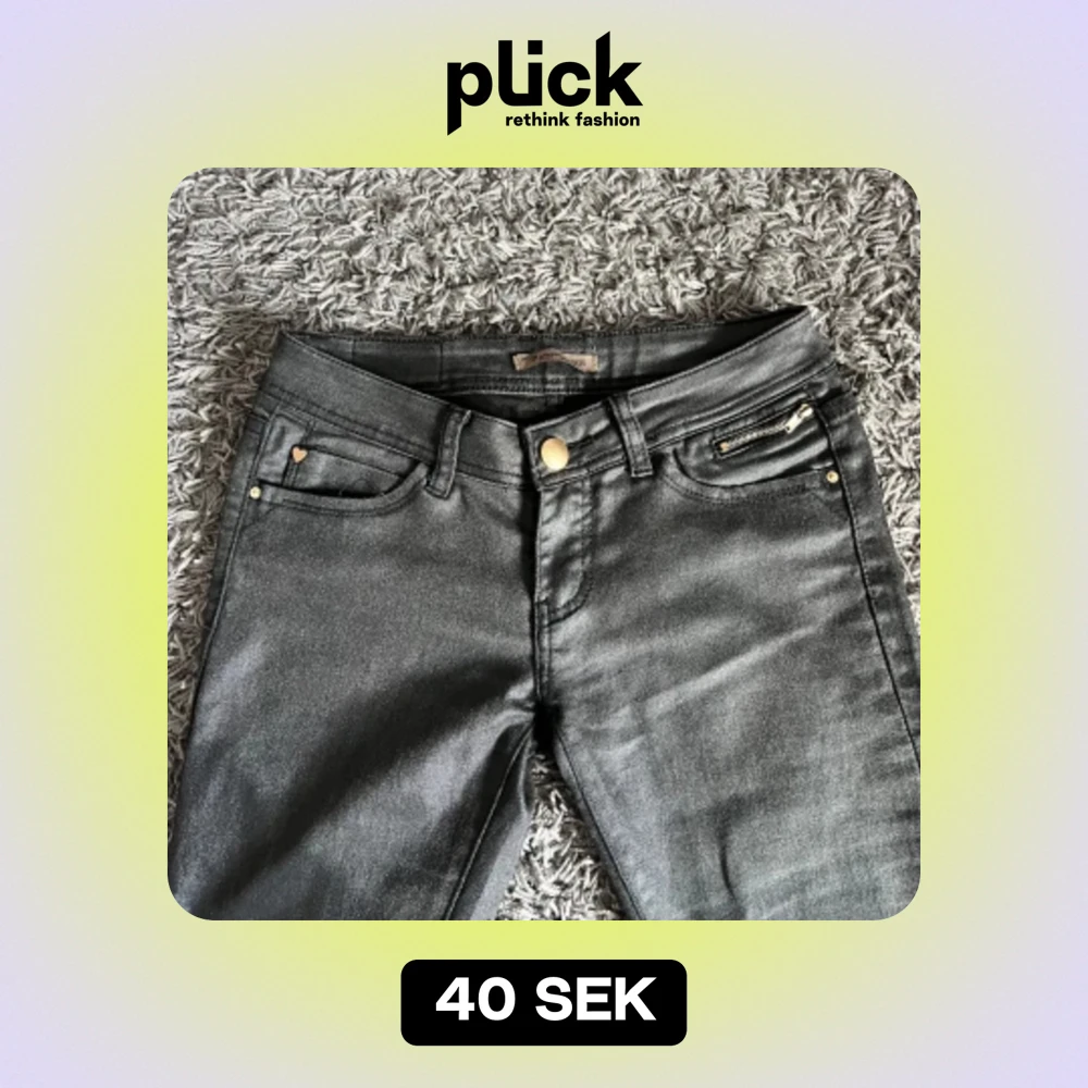 svarta skinn byxor med låg midja i mycket bra skick utan defekter. normal i storleken. midjemått: 36cm rakt över innerbenslängd: 77cm
