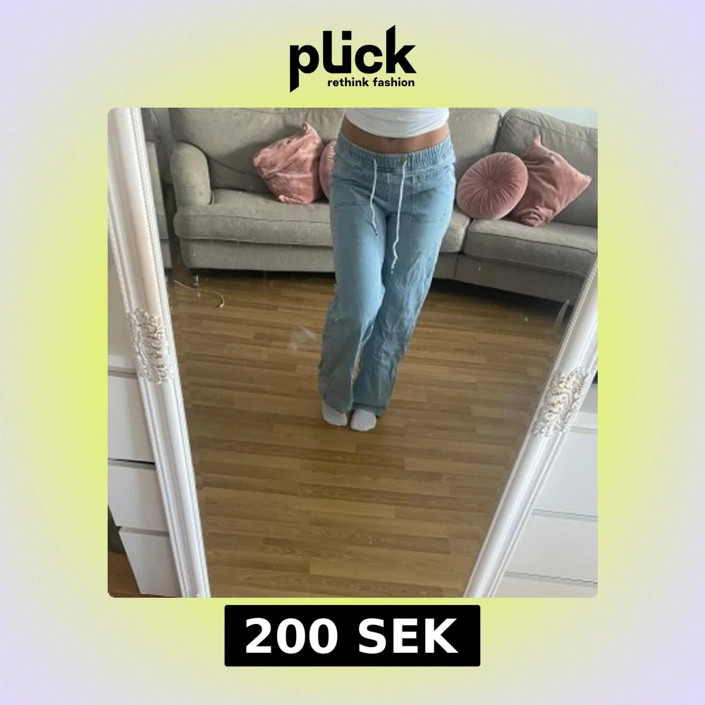 Säljer ett par ljusblå jeansbyxor med bred passform och resår i midjan. Byxorna har dragsko med färgade detaljer och stora fickor framtill. Perfekta för en avslappnad stil.