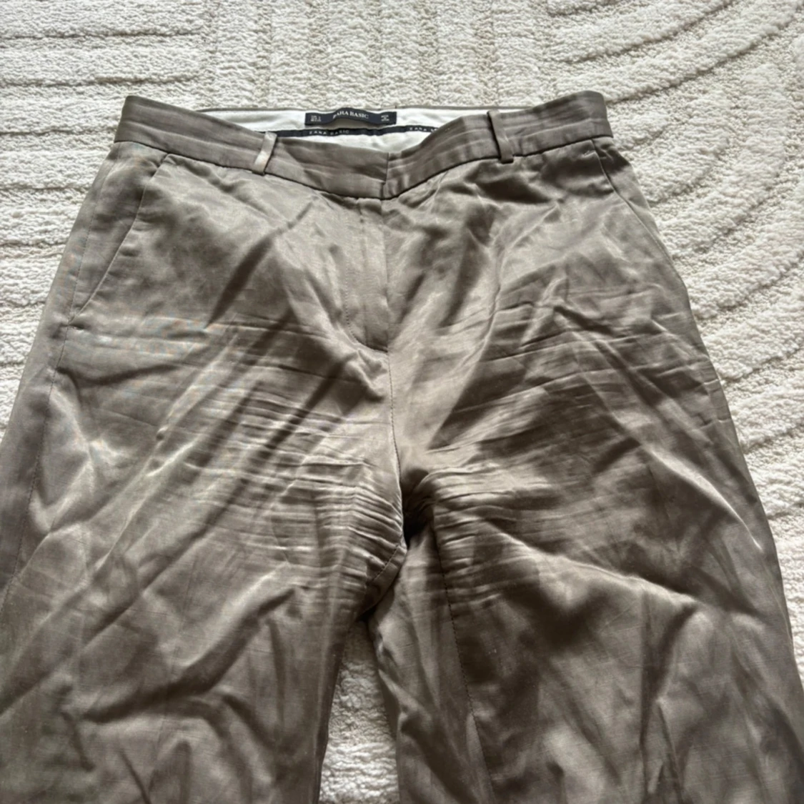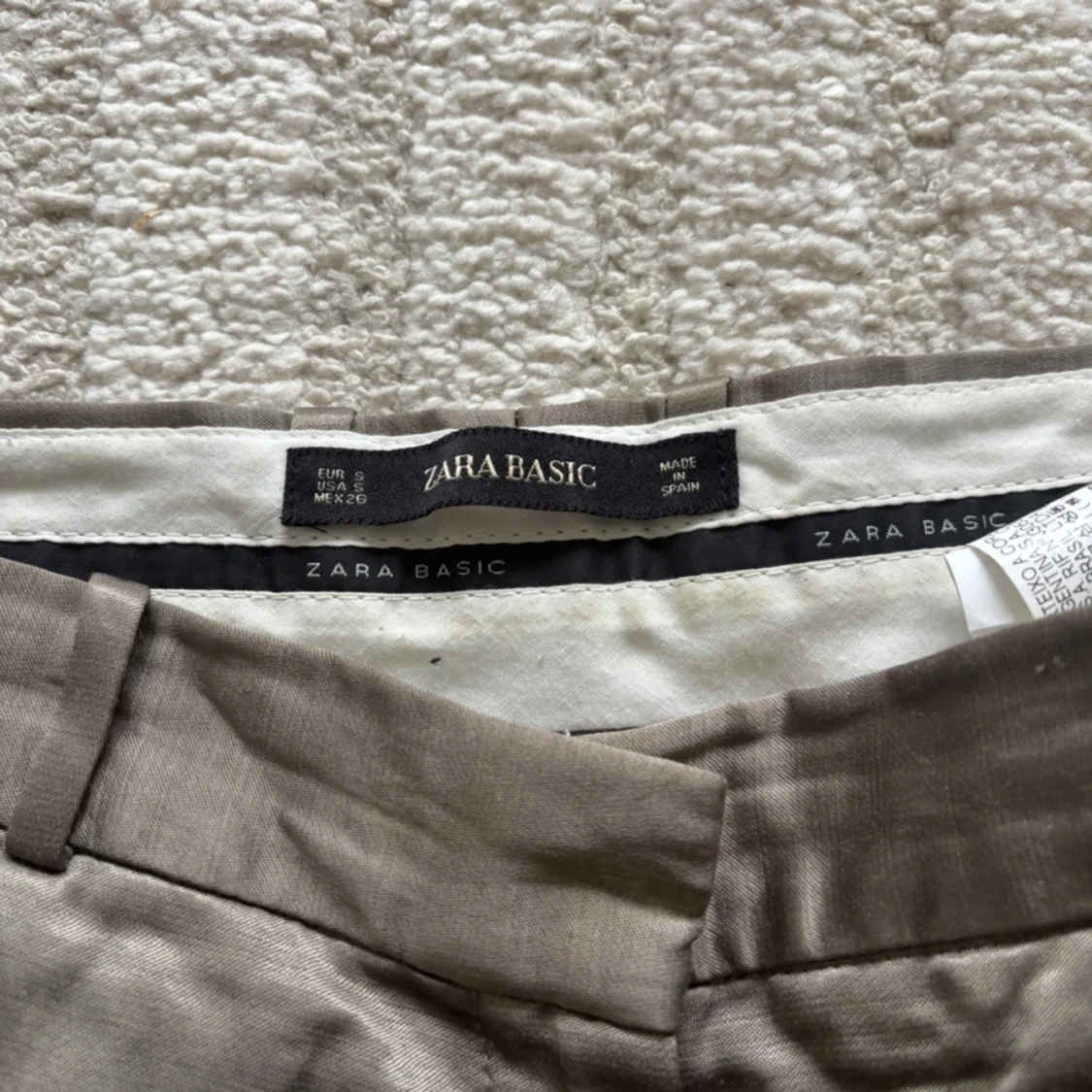 Snygga beige kostymbyxor från Zara Basic med klassisk passform och diskreta fickor. Perfekta för en stilren look och passar till många olika outfits. Byxorna har hällor för bälte och stängs med dragkedja och knapp.