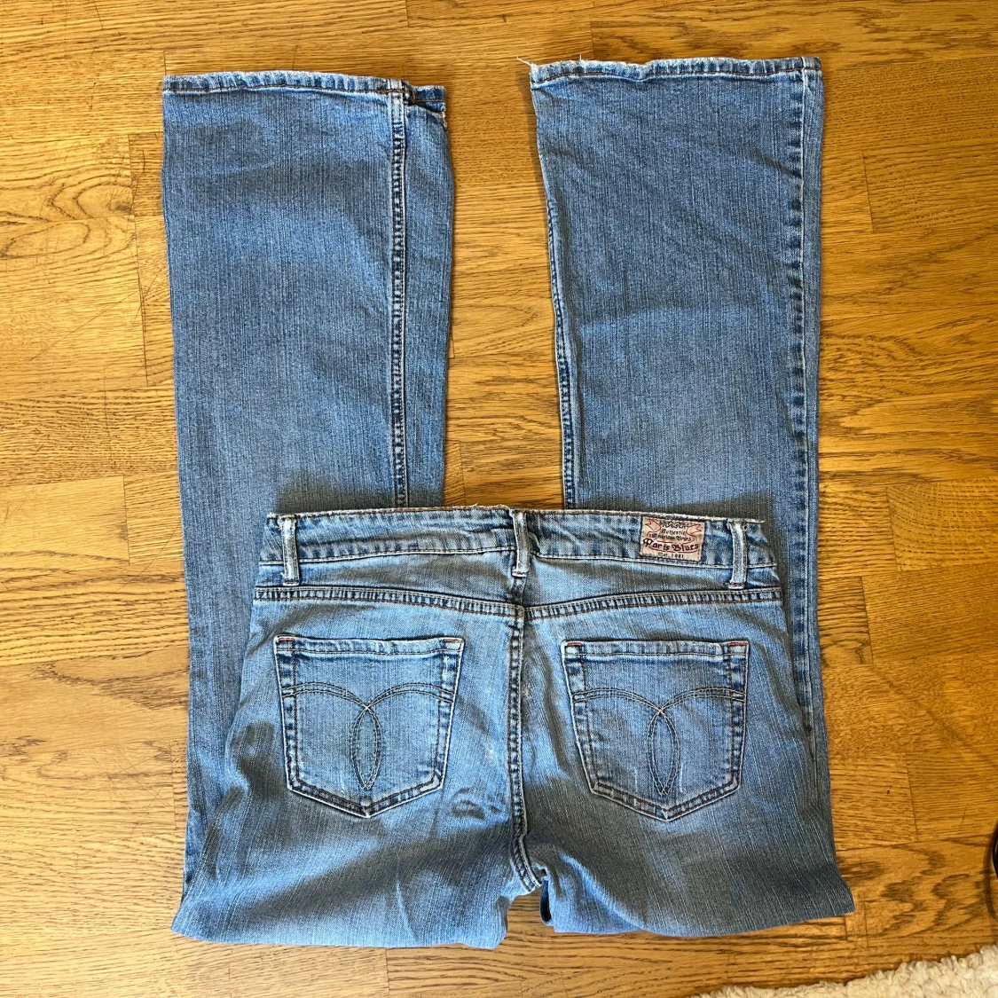 Säljer ett par klassiska blå jeans från Paris Blues med bootcut och normal passform. Jeansen har fem fickor, knappgylf och snygga detaljer på bakfickorna. Perfekta för dig som gillar en tidlös denimlook.
