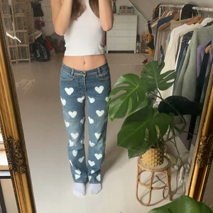 Så så fina lågmidjade jeans med vita hjärtan. Sitter så fint på! Jag är 165 cm lång. Köparen står för frakten🌈