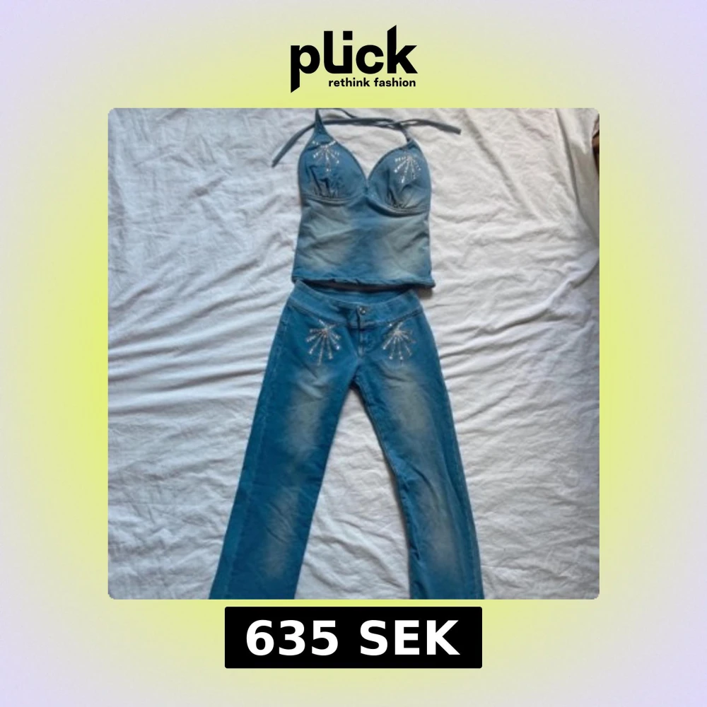 Säljer ett par blå jeansbyxor med låg midja och de är så finaaaa några diamanter är borta men de ser man inte, toppen sitter så bra i kroppen SUPER SNYGGA!!