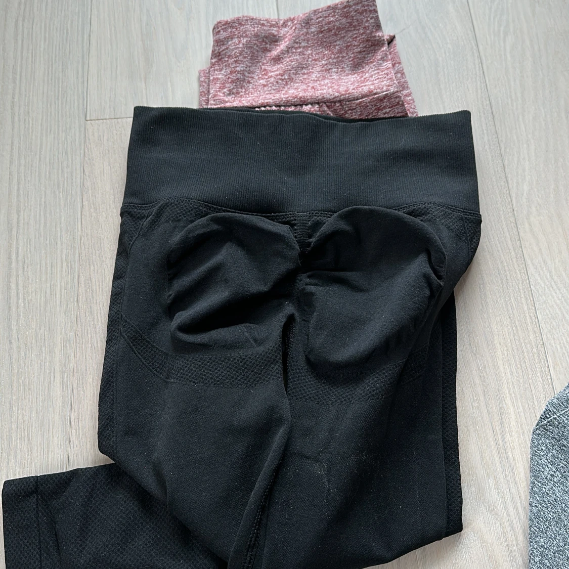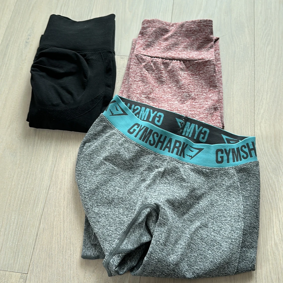3 par träningstights Svarta: SHEIN, strl S ( aldrig använda) 150kr. Rosa: SHEIN, strl S, ( kanppt använda) 100kr Gymshark: strl S(knappt använda) 299kr