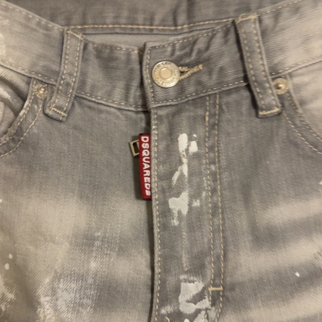 Säljer ett par grå jeans från Dsquared2 med coolt distressed utseende, slitna detaljer och vita färgstänk över hela byxorna. Modellen har rak passform och klassisk femficksdesign. Perfekt för dig som gillar edgy streetstyle.