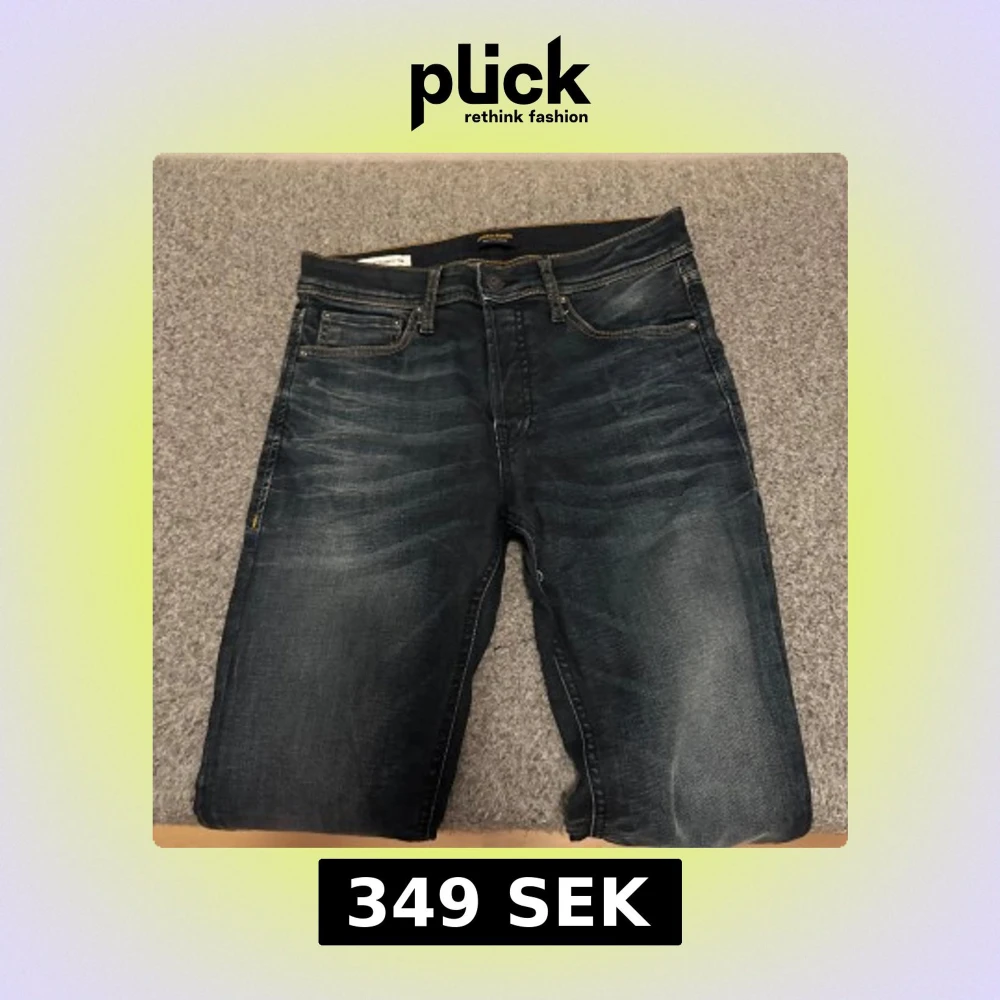 Snygga mörkblå jeans från Jack & Jones med klassisk femficksdesign och knappgylf. Perfekta för en avslappnad stil under varma dagar. 28/30 använda ca 10 gånger modell slim fit glen